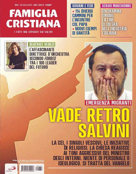 Nel numero in edicola giovedì 26 luglio, il periodico apre con l’emergenza migranti e fa il punto sull’impegno della Chiesa “contro certi toni sprezzanti e non evangelici”. Nel mirino Salvini, ritratto in copertina sotto una mano che si leva nel gesto, appunto, di indicare il “Vade retro” del titolo.