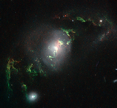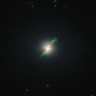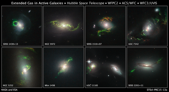 Bill Keel, ricercatore dell’Università dell’Alabama di Tuscaloosa che ha analizzato le foto scattate da Hubble ha sottolineato che i filamenti verdi sono diversi per ognuna delle galassie osservate dal telescopio spaziale. Si tratta di bizzarre formazioni, a volte a spirale altre elicoidali, che si attanagliano proprio intorno al centro di 8 galassie.
