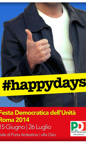 ROMA – Una foto di Fonzie e l’hashtag #happydays sul manifesto che annuncia l’inizio della Festa Democratica dell’Unità in programma dal 15 giugno a Roma. La festa si svolgerà fino al 26 luglio lungo viale di Porta Ardeatina e all’interno del parco di Villa Osio, la location consueta in cui, nella Capitale, si svolge da diversi anni la festa dal partito di Renzi.