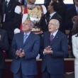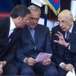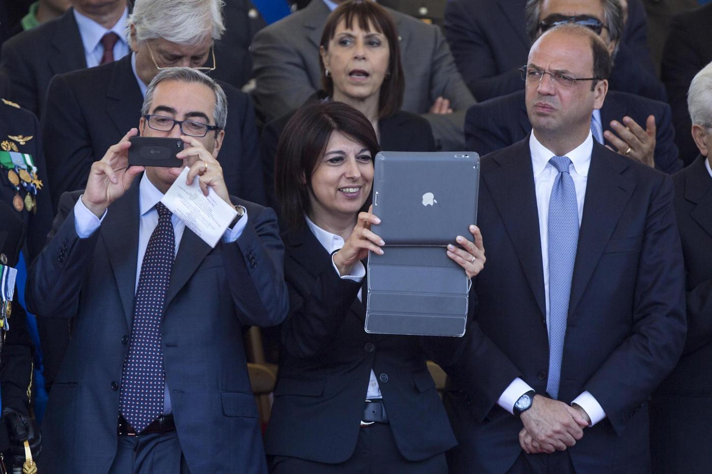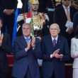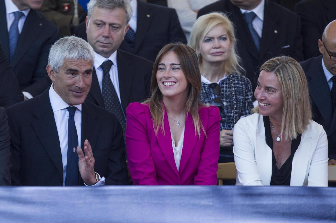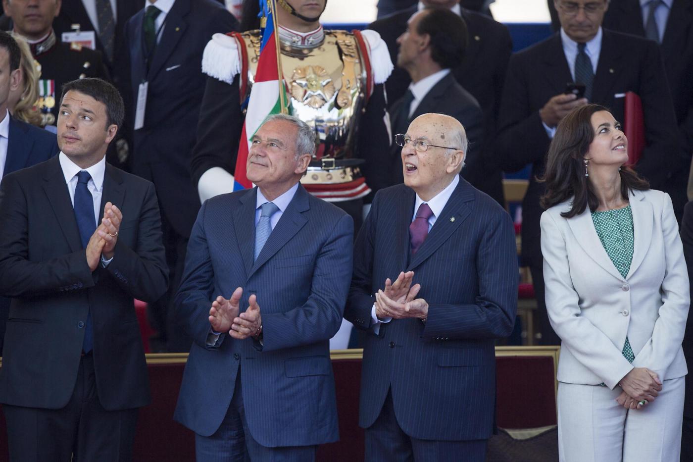 In tribuna il presidente della Repubblica, Giorgio Napolitano, arrivato con la storica Flaminia scoperta, accompagnato dal ministro della Difesa, Roberta Pinotti, dal presidente del Consiglio, Matteo Renzi, e dal Capo di Stato Maggiore della Difesa, ammiraglio Luigi Binelli Mantelli.