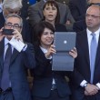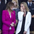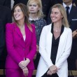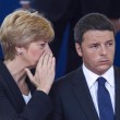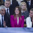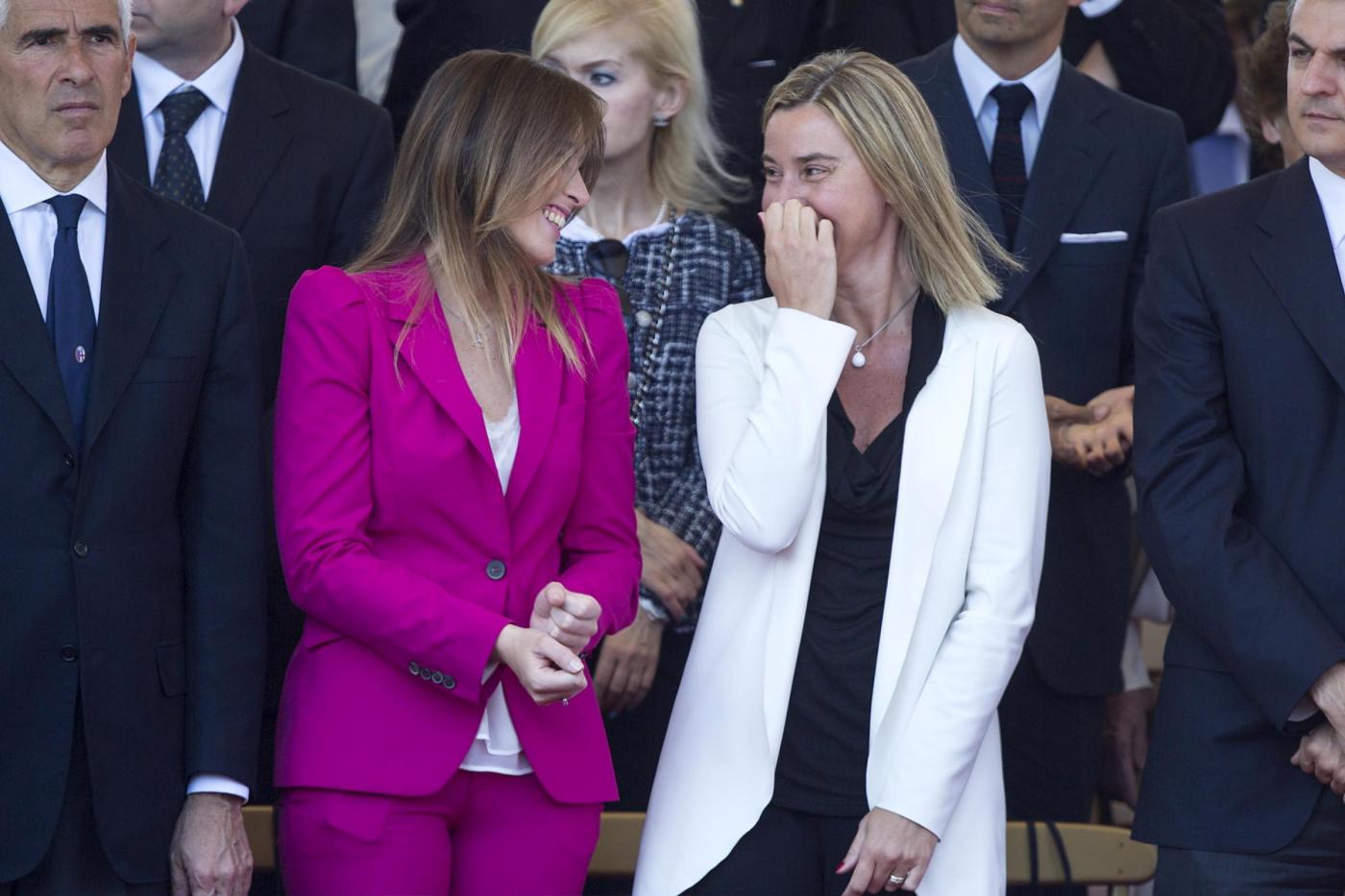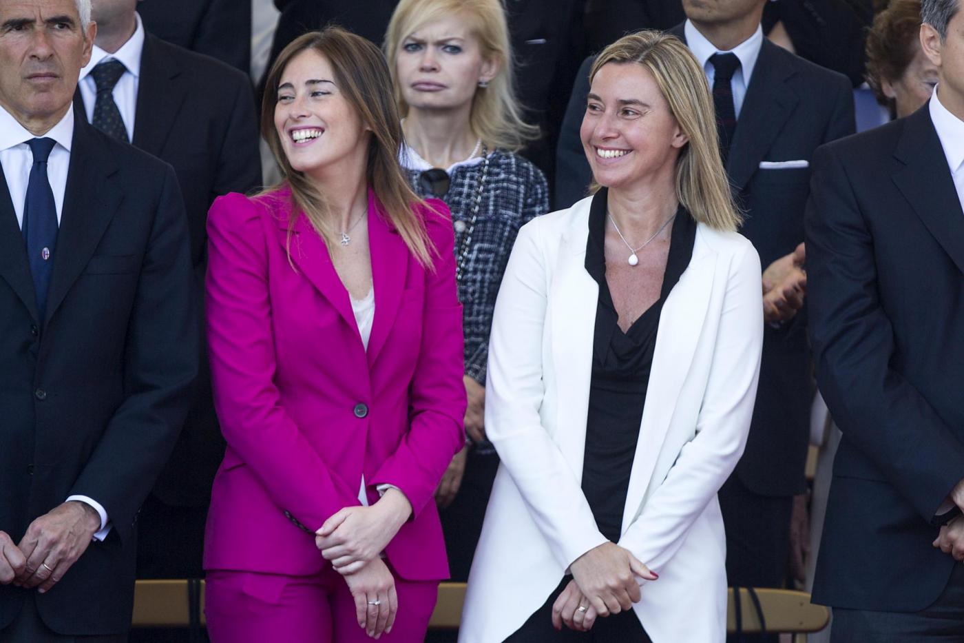 Folta la rappresentanza istituzionale in tribuna: i presidenti di Senato e Camera, Pietro Grasso e Laura Boldrini, in particolare si notavano i ministri Maria Elena Boschi con un vivace tailleur color fucsia, e il ministro Federica Mogherini particolarmente sorridente.