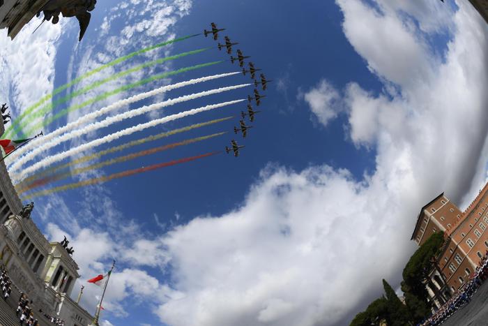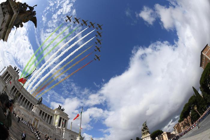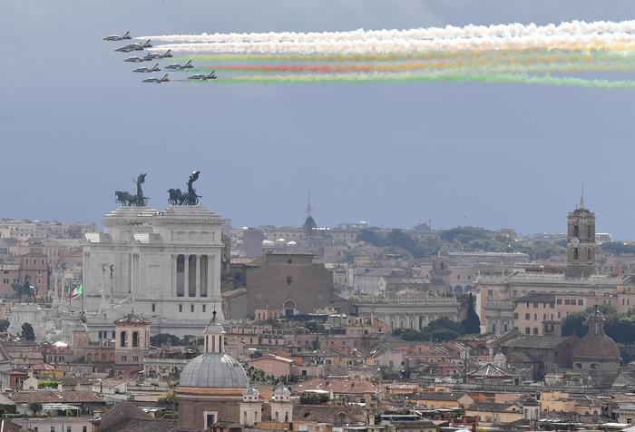 The famous Italian Air Force acrobatic team Frecce Tricolori flies over the Via dei Fori Imperiali during the military parade to mark the anniversary of the founding of the Italian Republic, Rome, 02 June 2016.
