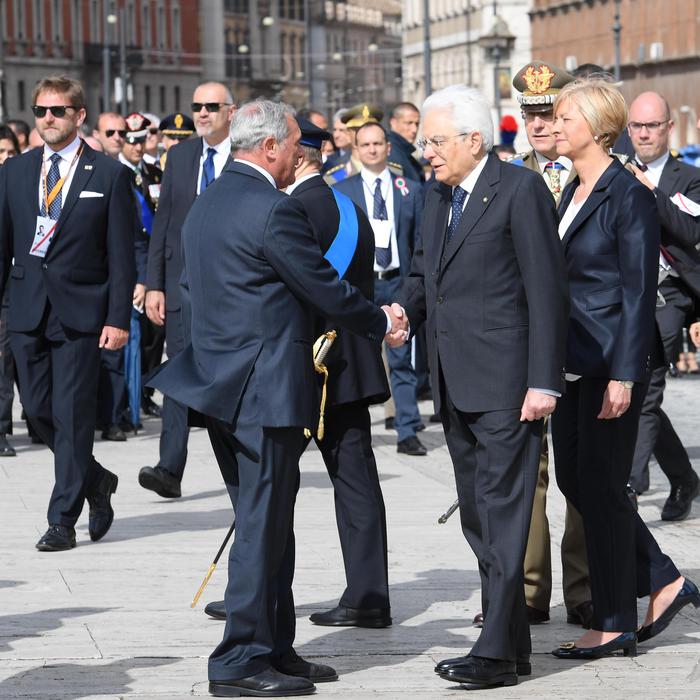 Italian President Sergio Mattarella (R) shakes hand with Italian President of Senate, Pietro Grasso (L), at the “Altare della Patria” (Altar of the Fatherland) during the Republic Day in Rome, Italy, 02 June 2016.