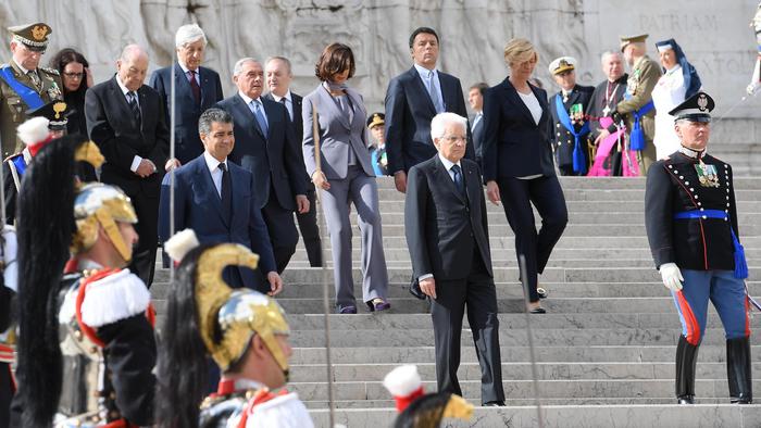 Italian President Sergio Mattarella (C / ahead) with Italian Prime Minister Matteo Renzi (2R), Italian President of Senate Pietro Grasso (4L), Italian President of Chambre of Deputies Laura Boldrini (3R) and Italian Defence Minister, Roberta Pinotti (R), at the “Altare della Patria” (Altar of the Fatherland) during the Republic Day in Rome, Italy, 02 June 2016.