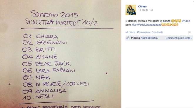 La foto della scaletta è apparsa su Facebook dopo la conferenza stampa di Carlo Conti, conduttore del festival, e delle sue vallette Emma Marrone, Arisa e Rocio Munoz Morales.