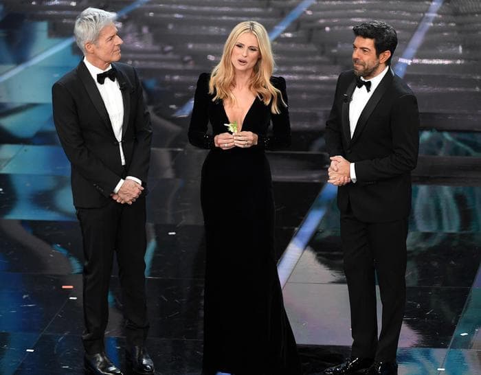 Michelle Hunziker in Armani Privé insieme a Claudio Baglioni e Pierfancesco Favino (Foto Ansa)