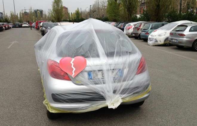 TORINO – Fiat impacchetta le auto straniere dei suoi impiegati. Un telo di plastica, un fiocco e una scritta: “Vederti con un’altra ci ha spezzato il cuore… Ma nonostante ciò continuiamo a pensare a te”. La strana dichiarazione d’amore è apparsa sulle macchine dei dipendenti Fiat dello stabilimento di Mirafiori, Torino. I proprietari se le sono ritrovate così all’uscita dal lavoro.