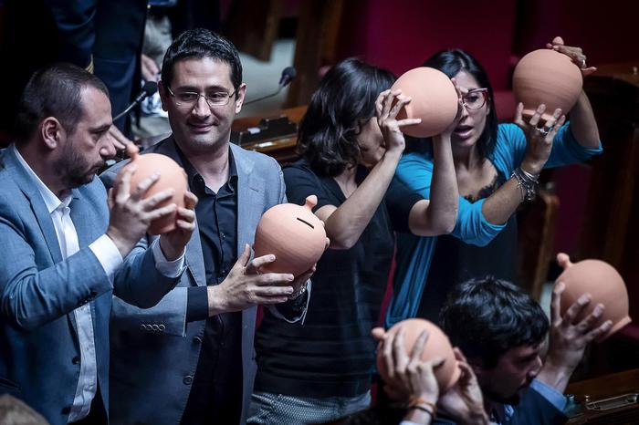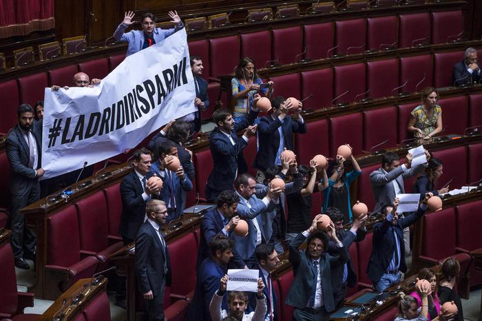 ROMA – Il governo ha posto la questione di fiducia nell’Aula della Camera sul dl banche venete. Non appena il ministro con i Rapporti con il Parlamento Anna Finocchiaro ha posto la fiducia sul dl banche, si è scatenata la protesta dei deputati M5S nell’Aula della Camera. I deputati hanno innalzato un enorme striscione con la scritta “ladri di risparmi” e “No al ricatto delle banche”. In mano decine di salvadanai di ceramica con dentro delle monetine che hanno fatto risuonare in Aula.