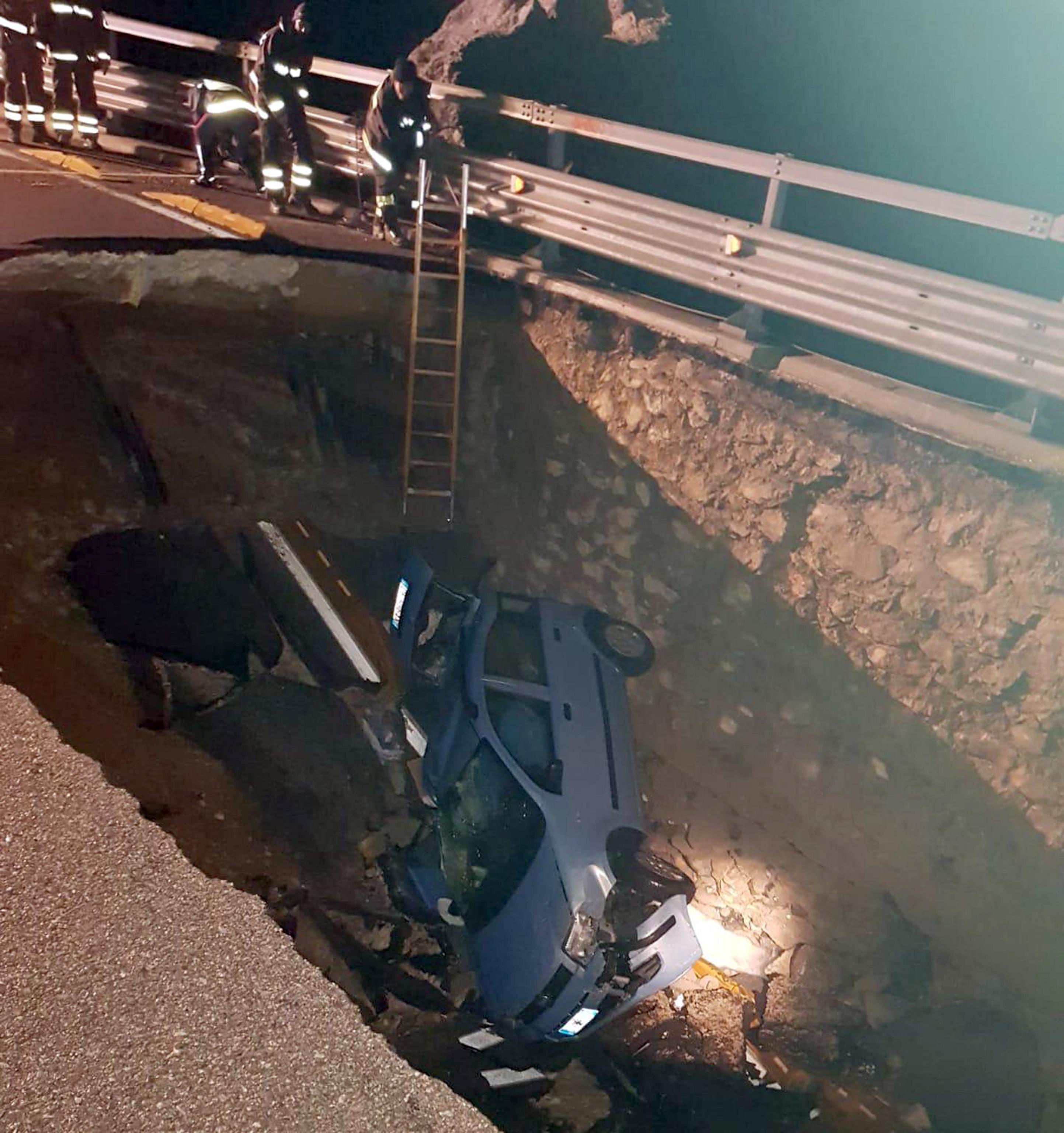 Alle 5 di questa mattina, 30 ottobre, è collassata una delle due carreggiate aprendo una voragine profonda 6 metri dentro la quale è finita una Fiat Pianda. La donna che si trovava al volante, 70 anni, è stata trasportata in codice giallo al pronto soccorso dell’ospedale Santa Corona di Pietra Ligure. Ha riportato fortunatamente solo un lieve trauma cranico e una contusione alla spalla.