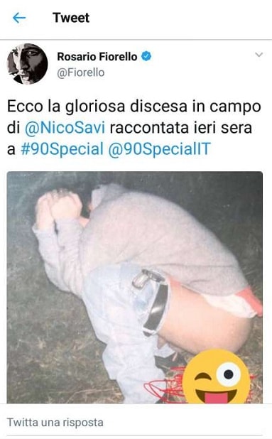 ROMA – Nicola Savino in prima serata su Italia 1 con “90 Special”, lo show che celebra gli anni ’90. Con la neo Iena ci sono Cristiano Malgioglio e Katia Follesa. Fiorello è un grande amico di Savino. E per seguire lo spirito della trasmissione pubblica una foto su Twitter del conduttore in cui si vede Savino “impegnato” su un campo all’aperto.“Ecco la gloriosa discesa in campo di Nicola Savino” scrive Fiorello. Peccato però che la foto ha un emoji in meno e mostra ai suoi follower più di quanto dovrebbe mostrare.