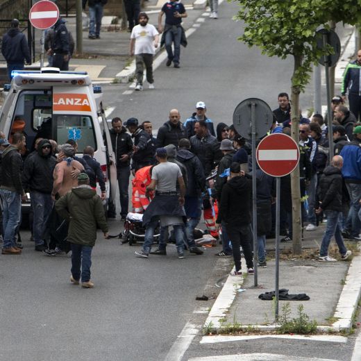 Tafferugli tra i gruppi di sostenitori si sono verificati in altre zone vicino all’Olimpico. Anche nello stadio, poi, ci sono stati lanci di petardi e bombe carta. Poco prima delle 19 gli spari, nei pressi di un vivaio. Le ricostruzioni sono ancora molto confuse. Il dato certo è che sono stati esplosi alcuni colpi di pistola che hanno ferito tre napoletani: un trentenne, il più grave, alla colonna vertebrale.