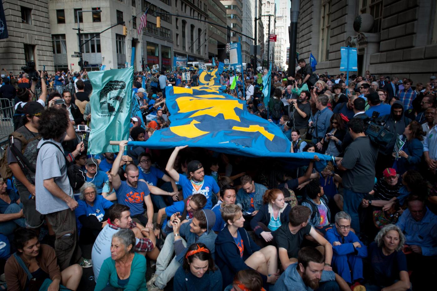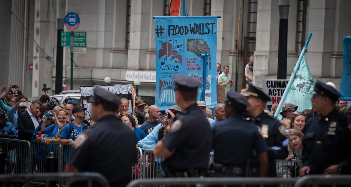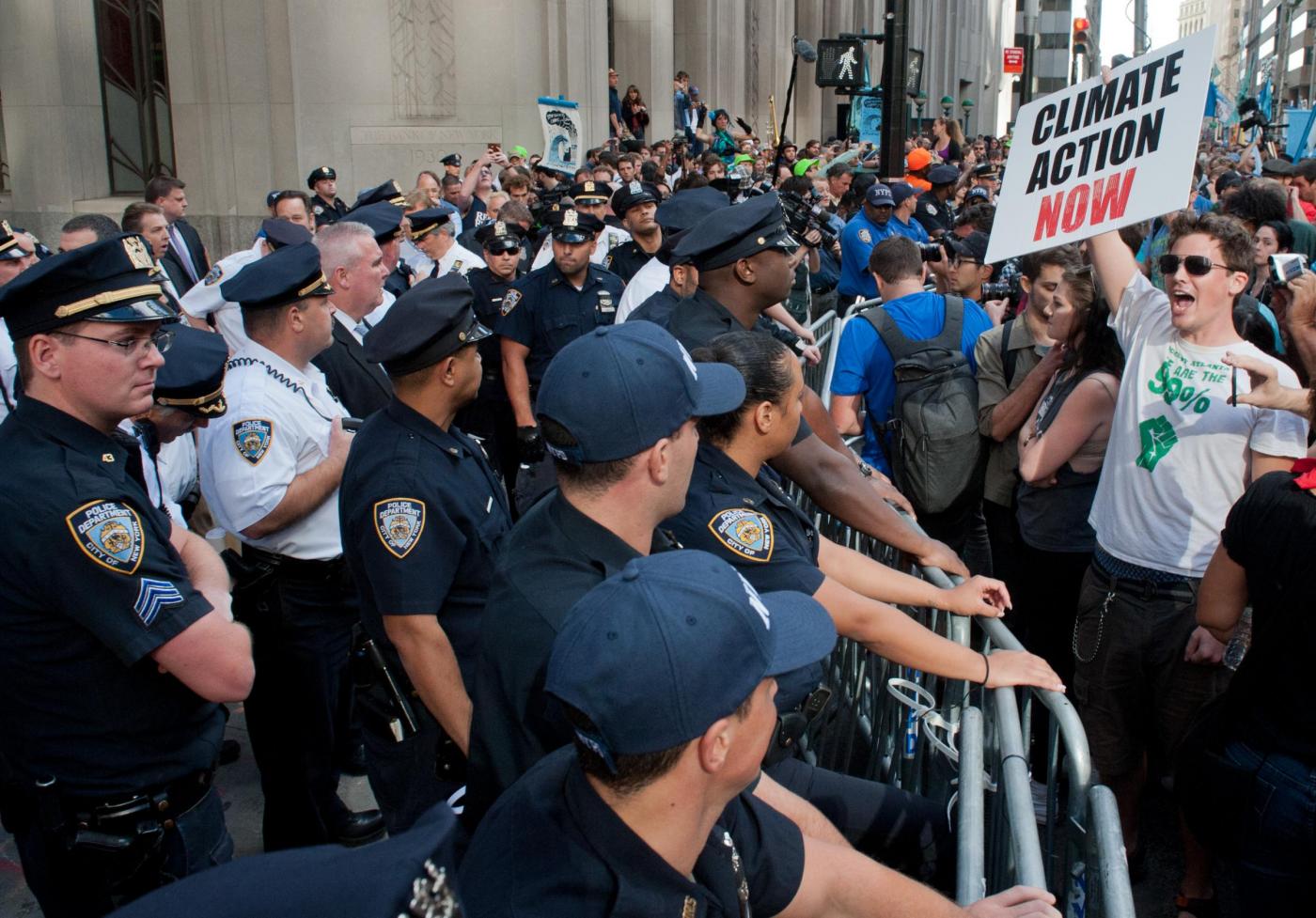 NEW YORK – La polizia di New York ha arrestato circa 100 persone che a Wall Street hanno preso parte alle proteste contro un sistema di interessi economici e finanziari considerato responsabile dei cambiamenti climatici. La mobilitazione del movimento #FloodWallStreet rievoca l’Occupy Wall Street di tre anni fa. In quell’occasione, i manifestanti occuparono per mesi un parco nei pressi del cuore finanziario d’America. Questa nuova manifestazione è avvenuta in vista del Climate Summit che il segretario generale dell’Onu Ban Ki-moon ha convocato al Palazzo di Vetro per discutere con circa 120 leader mondiali dell’emergenza clima.