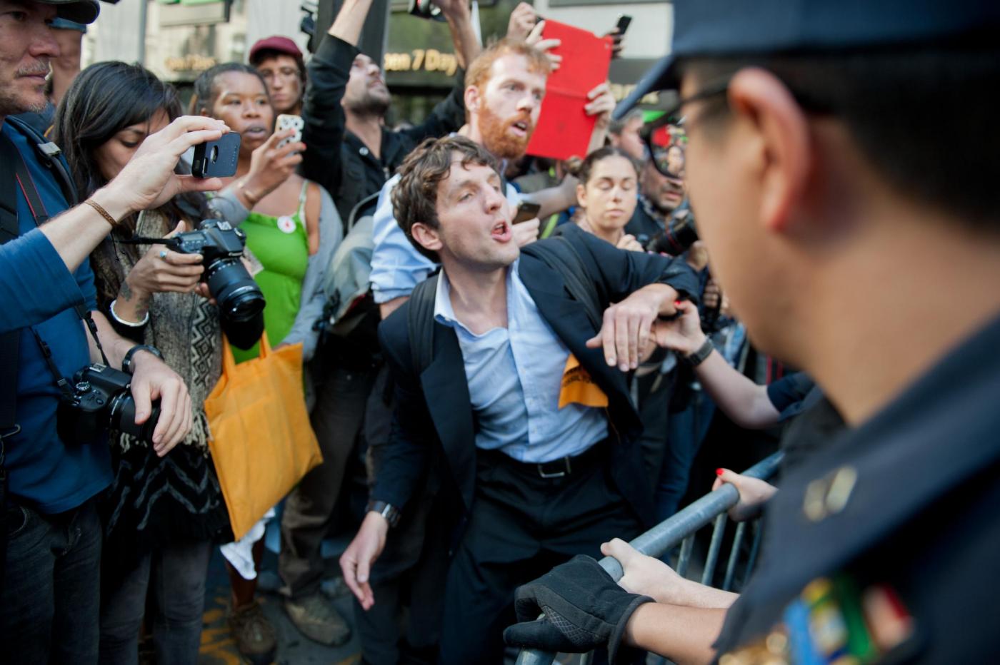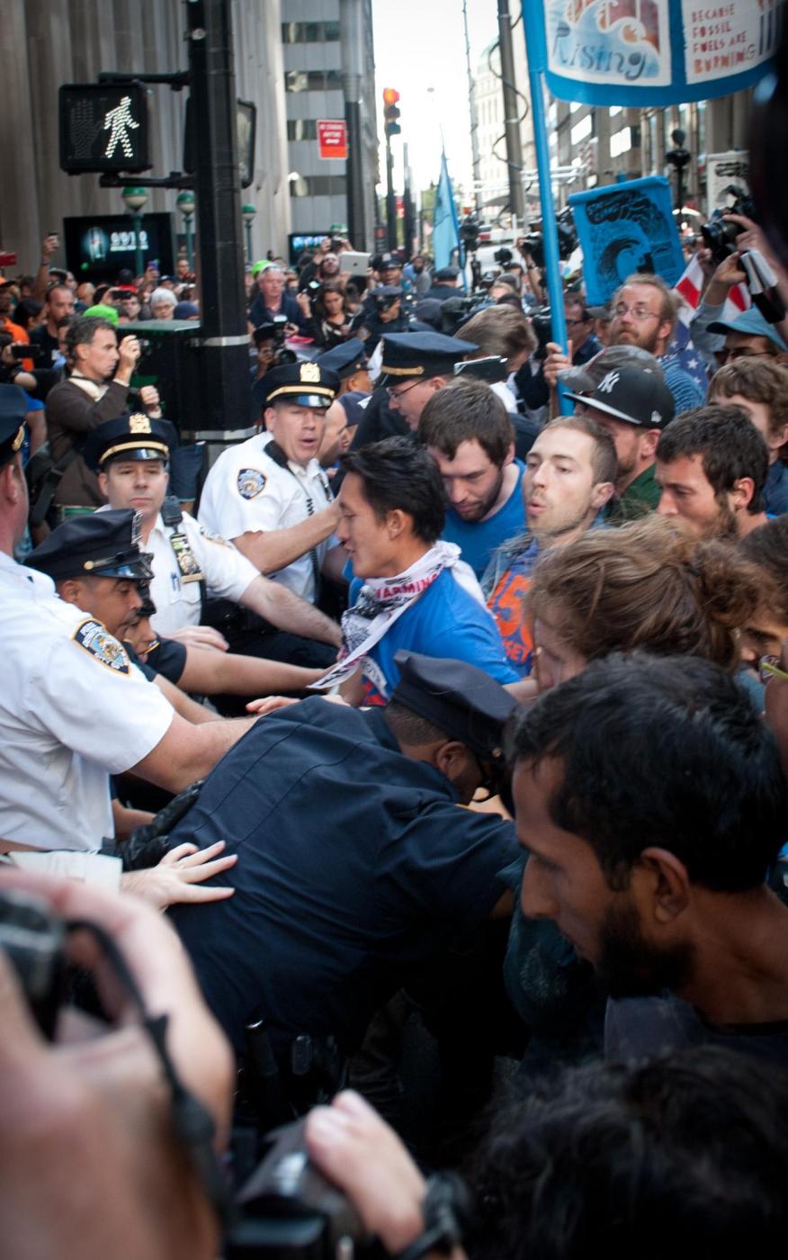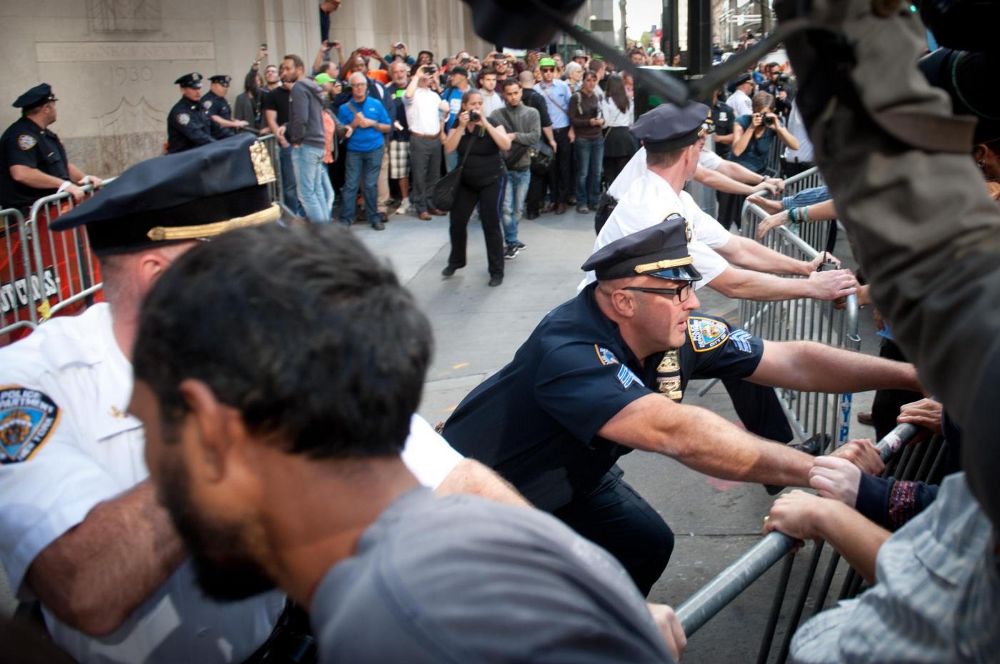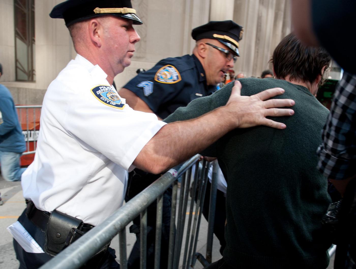 Le tensioni con la polizia si sono registrate quando i dimostranti hanno cercato di rimuovere le transenne di metallo che erano state messe per impedire loro di entrare a Wall Street. La polizia ha respinto i manifestanti, ed ha arrestato alcuni manifestanti Il grosso degli arresti è avvenuto quando i manifestanti, qualche ora dopo hanno cominciato un sit-in che ha bloccato Broadway. La carica e gli arresti dei manifestanti, sono partiti dopo la richiesta da parte delle forze dell’ordine, di disperdersi.