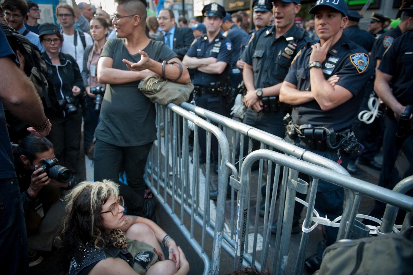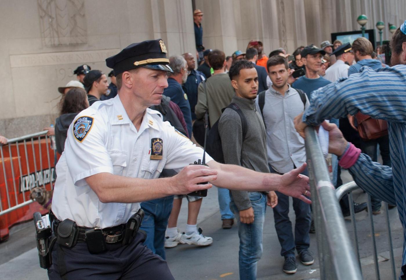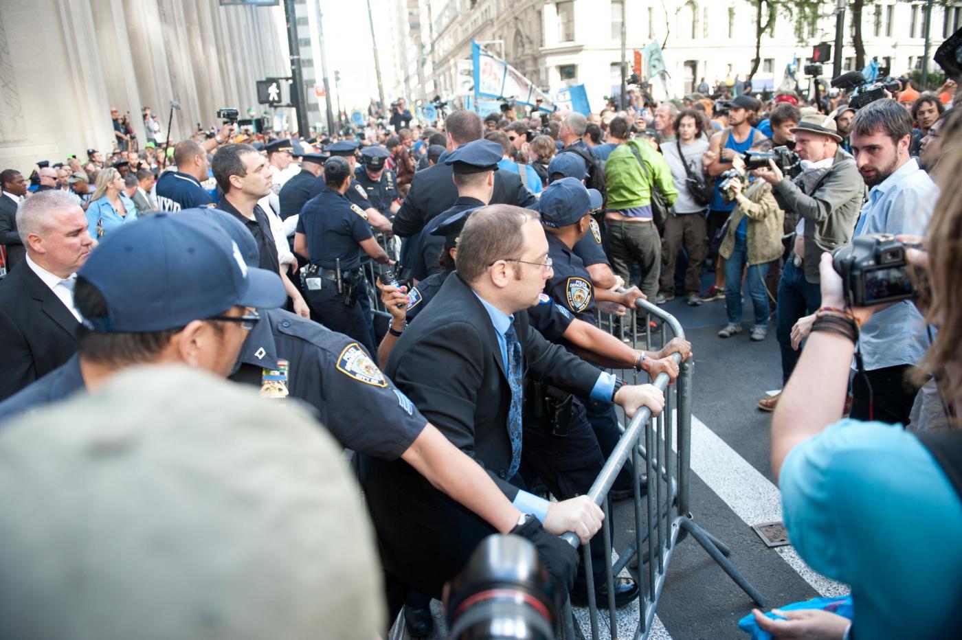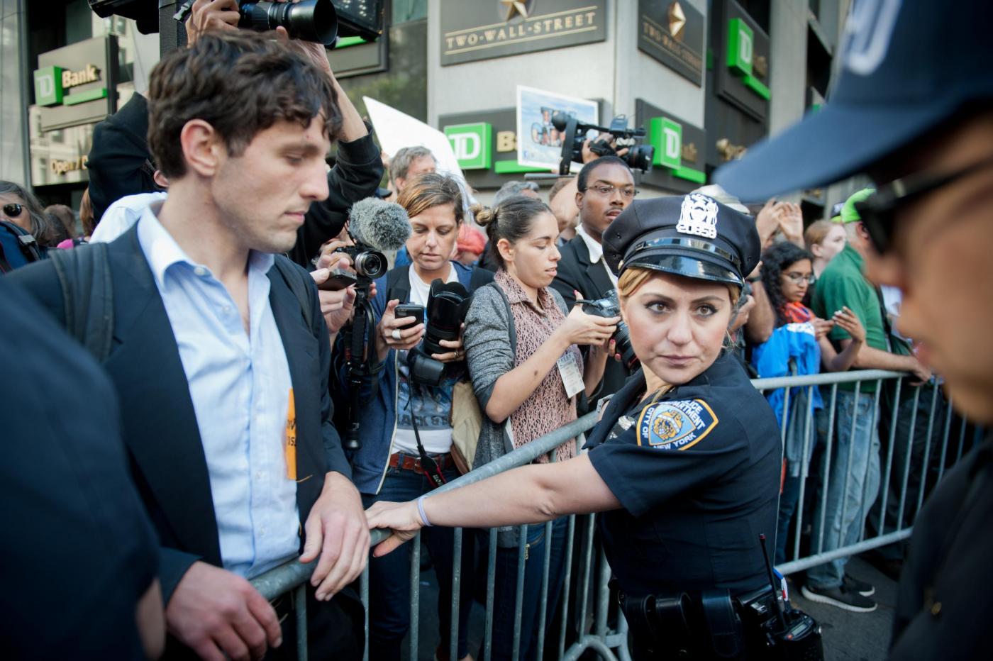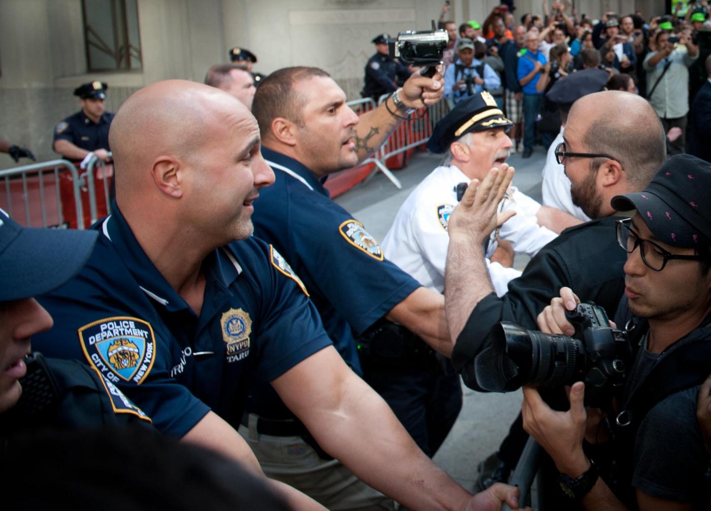 Le tensioni con la polizia si sono registrate quando i dimostranti hanno cercato di rimuovere le transenne di metallo che erano state messe per impedire loro di entrare a Wall Street. La polizia ha respinto i manifestanti, ed ha arrestato alcuni manifestanti Il grosso degli arresti è avvenuto quando i manifestanti, qualche ora dopo hanno cominciato un sit-in che ha bloccato Broadway. La carica e gli arresti dei manifestanti, sono partiti dopo la richiesta da parte delle forze dell’ordine, di disperdersi.