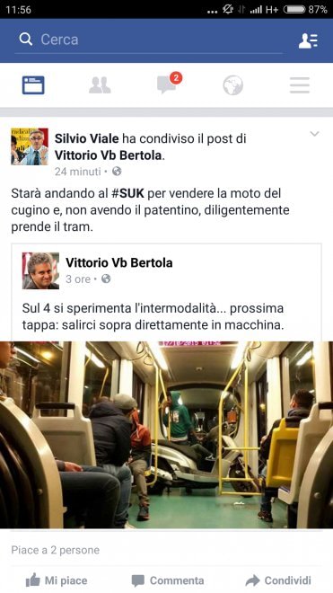 “Sul 4 – scrive Bertola su facebook – si sperimenta l’intermodalità. Prossima tappa: salirci sopra direttamente con l’auto”.