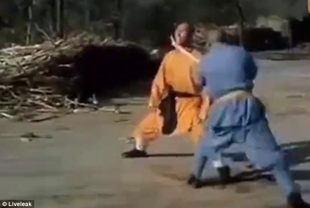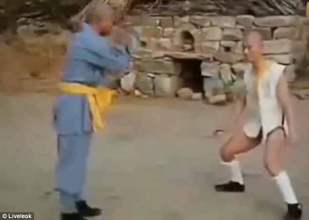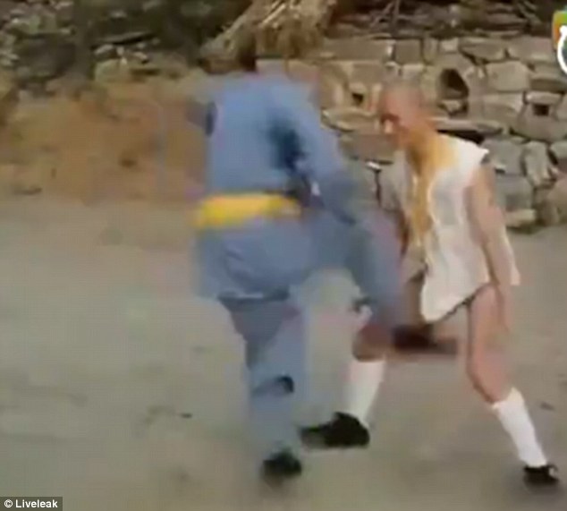 Il monaco apre le gambe e viene colpito da un collega con diversi calci sulle parti basse. Shi-Win-Yu, questo il nome del monaco, dopo essere stato preso a calci permette all’altro monaco di colpirlo sul collo e di rompere un bastone di legno sempre sul collo.