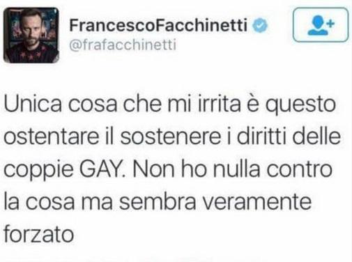 “Unica cosa che mi irrita – avrebbe scritto il conduttore al termine dell’esibizione di Noemi, che al microfono ha legato una simbolica sciarpa arcobaleno – è questo ostentare il sostenere i diritti delle coppie GAY. Non ho nulla contro la cosa ma sembra veramente forzato”.