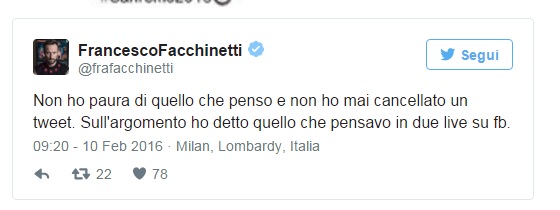 “Non ho paura di quello che penso e non ho mai cancellato un tweet. Sull’argomento ho detto quello che pensavo in due live su fb”.