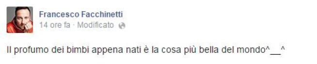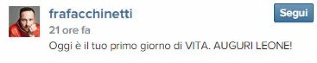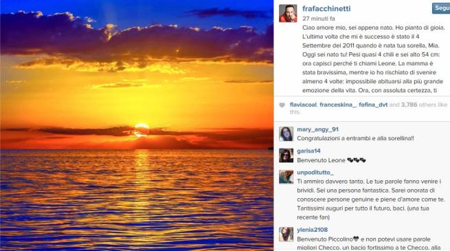 Questo il tenero messaggio che Facchinetti ha scritto per il figlio su Instagram e Facebook: “Ciao amore mio, sei appena nato. Ho pianto di gioia. L’ultima volta che mi è successo è stato il 4 Settembre del 2011 quando è nata tua sorella, Mia. Oggi sei nato tu! Pesi quasi 4 chili e sei alto 54 cm: ora capisci perché ti chiami Leone. La mamma è stata bravissima, mentre io ho rischiato di svenire almeno 4 volte: impossibile abituarsi alla più grande emozione della vita. Ora, con assoluta certezza, ti posso dire che le donne ci battono 10000 a 0, ricordatelo sempre. Affronta sempre la vita guardando l’orizzonte, fai in modo che nessuno ti metta barriere e sentiti sempre LIBERO. Cammina con la faccia verso il sole e goditi ogni secondo, ogni attimo, ogni respiro. Non avere paura di niente e di nessuno perché i tuoi genitori saranno sempre con te. Benvenuto amore mio nell’avventura più bella che ci sia: LA TUA VITA. Ti amo Papà”.
