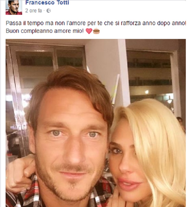 ROMA – Francesco Totti fa gli auguri di buon compleanno a sua moglie Ilary Blasi. Il capitano della Roma utilizza tutti i social che ha a disposizione, Facebook, Instagram e Twitter, per condividere una foto che lo ritrae insieme a sua moglie. La coppia è teneramente abbracciata e sotto di loro la scritta: