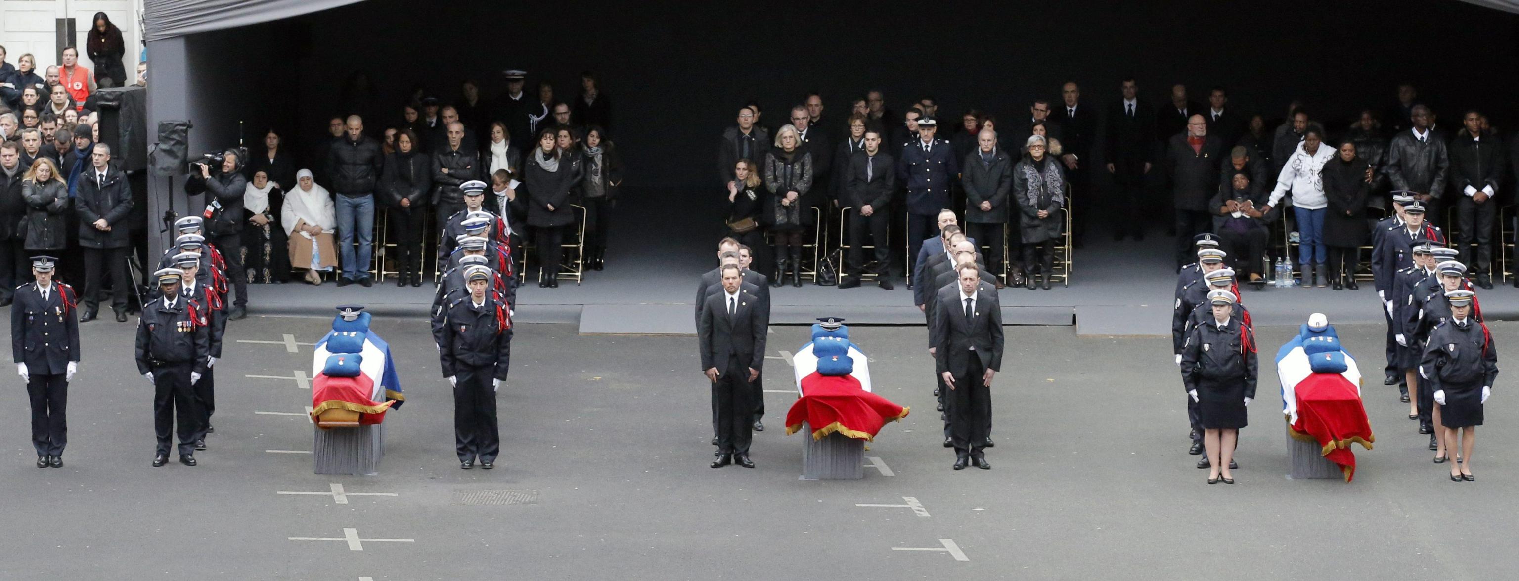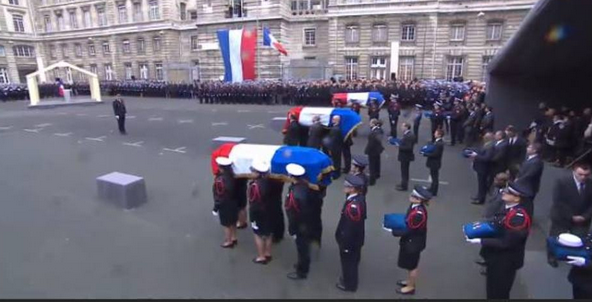 PARIGI -“Clarissa, Franck, Ahmed, sono morti perché noi potessimo continuare a vivere liberi”. Ad affermarlo è il presidente francese Francois Hollande che ha partecipato alla cerimonia alla Prefettura di Parigi per i tre poliziotti uccisi dai jihadisti nei giorni scorsi a ridosso della strage al Charlie Hebdo.