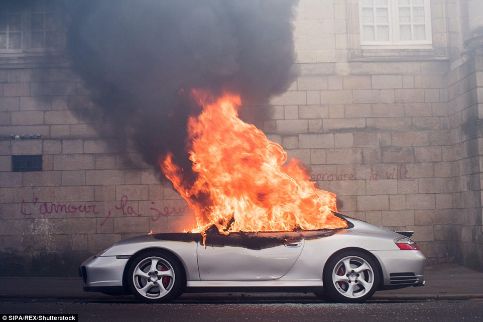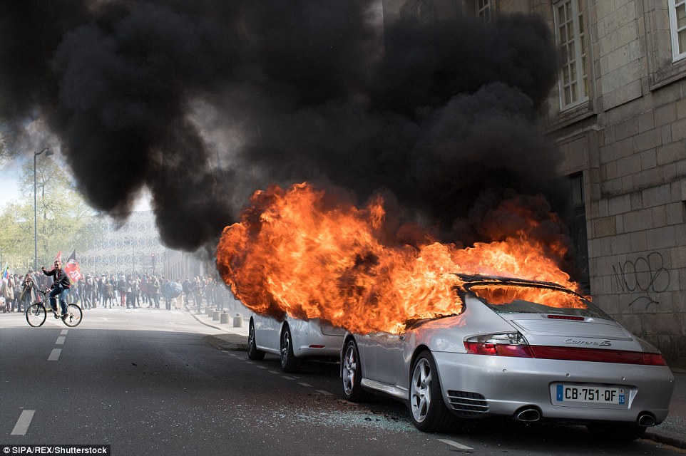 La questura precisa che “300 manifestanti incappucciati” hanno attaccato le forze dell’ordine. Negli scontri, due agenti sono rimasti feriti, di cui uno, appunto, in stato grave. Teatro delle violenze è stata la zona del Pont d’Austerlitz, uno dei ponti che attraversano la Senna. A Parigi, aggiunge la polizia, sono scattati almeno cinque fermi. Ma i casseur sono entrati in azione in tante altre città di Francia con decine di fermi, oltre sessanta soltanto a Marsiglia. Mentre su Twitter impazza la foto di una Porsche incendiata dai black bloc. Al termine della quarta giornata di mobilitazione la polizia ha dovuto procedere a 124 fermi tra casseurs e facinorosi che si sono introdotti nei cortei pacifici per seminare violenze e disordini. Ventotto sono invece gli agenti feriti di cui tre in condizioni gravi: è quanto ha riferito il ministro dell’Interno, Bernard Cazeneuve (foto Ansa):