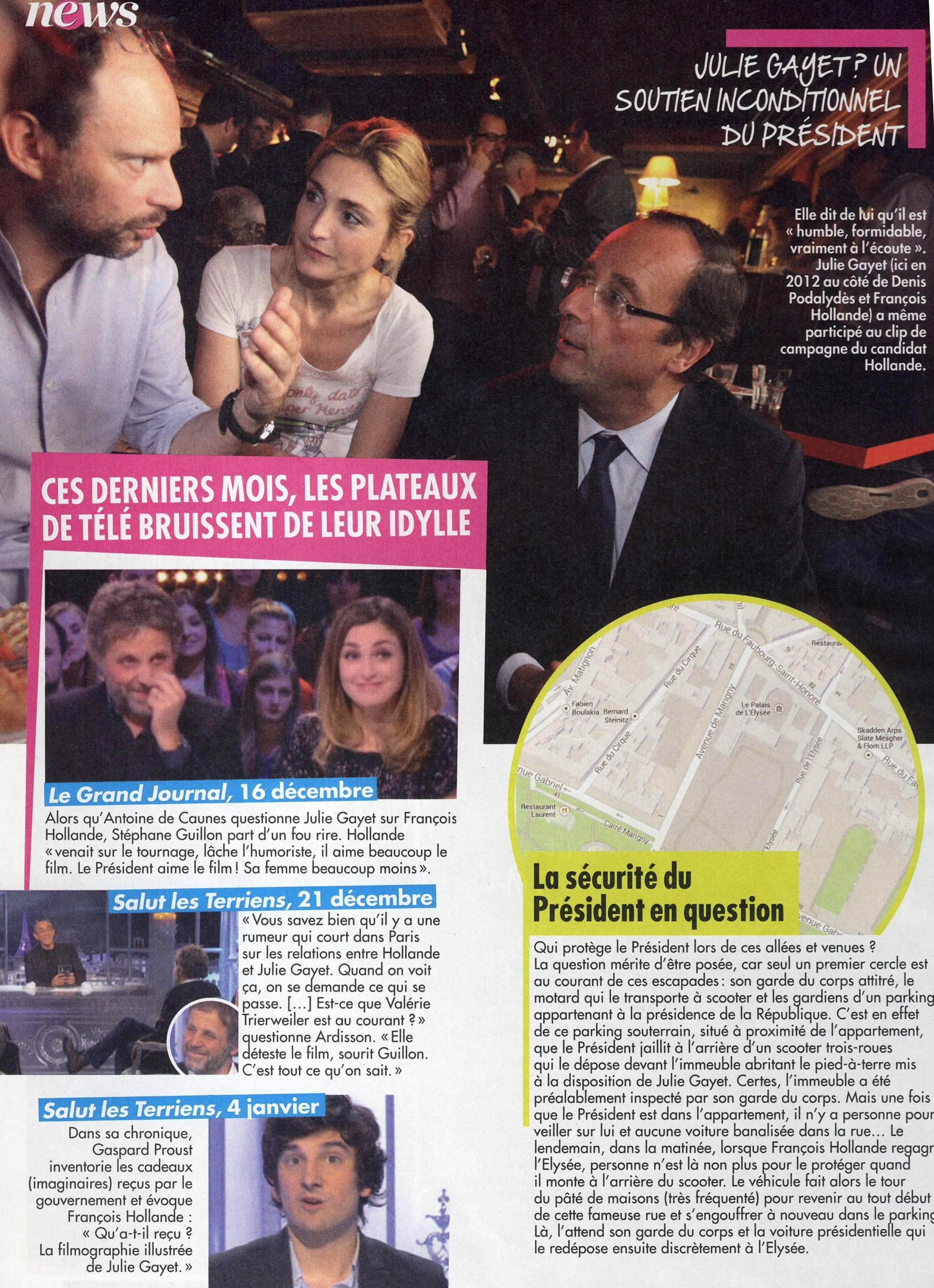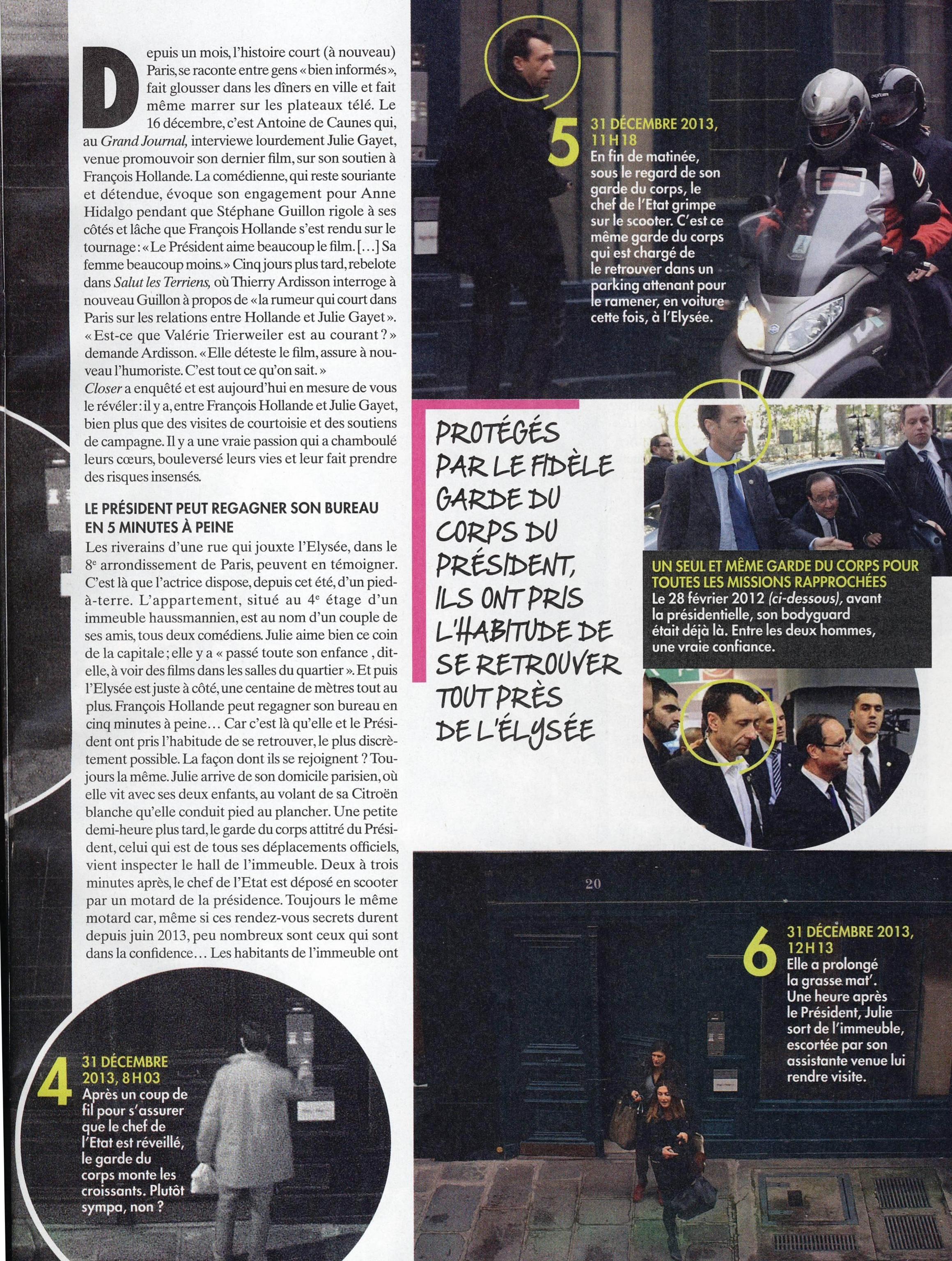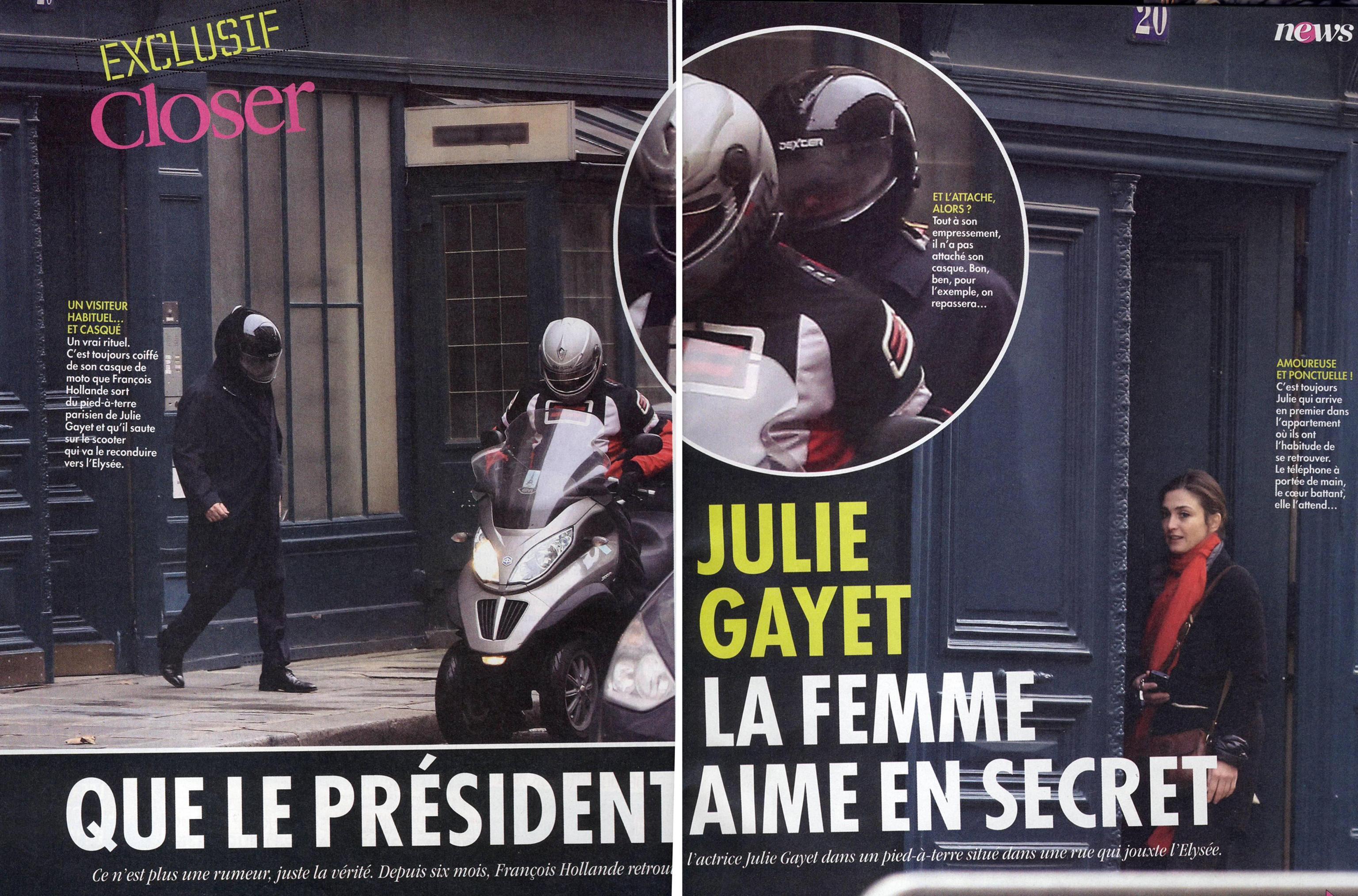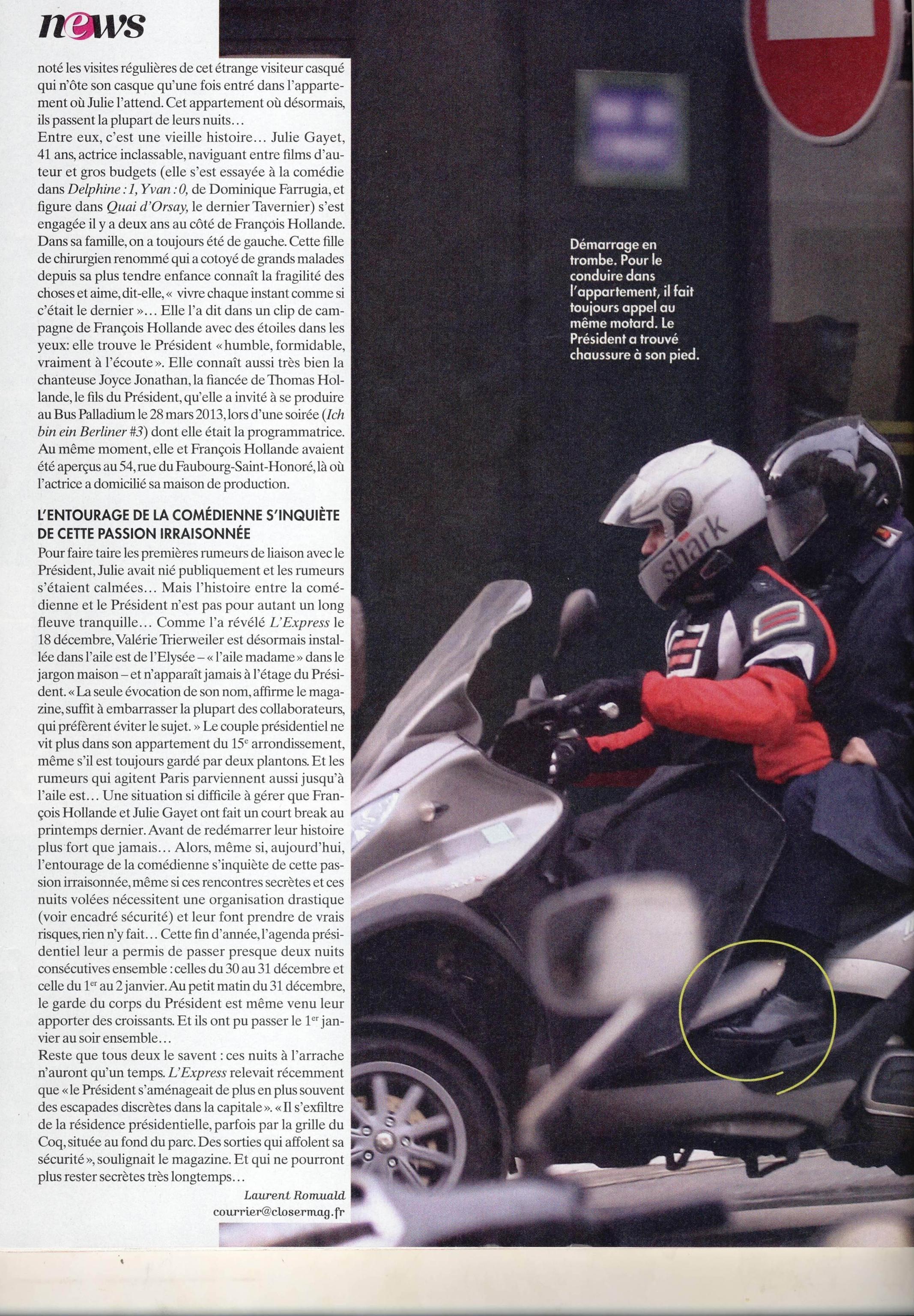Laurence Pieau, direttrice di Closer, ha confermato che toglierà “probabilmente stasera” dal sito internet della rivista, su richiesta dell’avvocato dell’attrice, le informazioni sulla presunta love story fra Hollande e la Gayet. “L’avvocato di Julie Gayet – ha detto la Pieau – ci ha contattato per chiederci di ritirare dal sito qualsiasi riferimento a questa relazione e di vigilare sulle ricadute su Google”. Nulla sembra sia stato chiesto dai legali dell’attrice riguardo alla versione cartacea della rivista (vedi le foto qui di seguito).