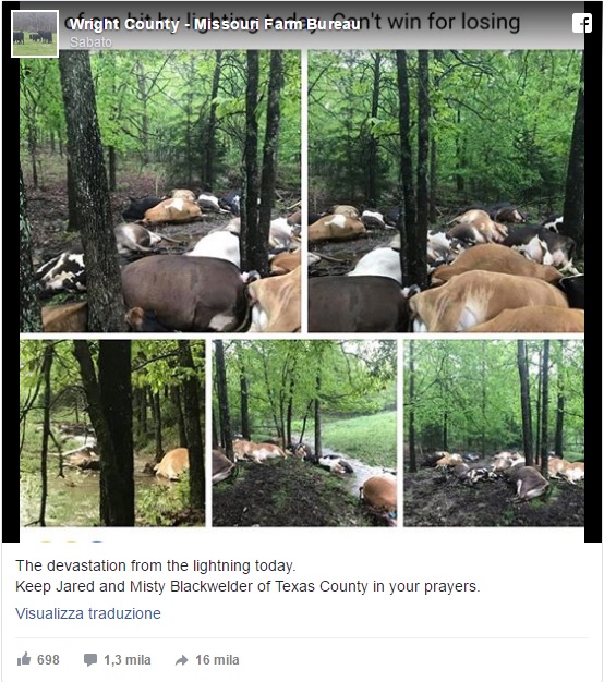 SPRINGFIELD – Trentadue mucche morte, accatastate una accanto all’altra. Non è una delle piaghe d’Egitto ma lo scenario raccapricciante che un allevatore del Missouri, Jared Blackwelder, si è trovato dinanzi agli occhi sabato scorso. Le foto bibliche della mattanza sono state pubblicate dallo stesso allevatore su Facebook e in breve tempo hanno ottenuto migliaia di condivisioni. A uccidere le povere vacche sarebbe stato un fulmine.