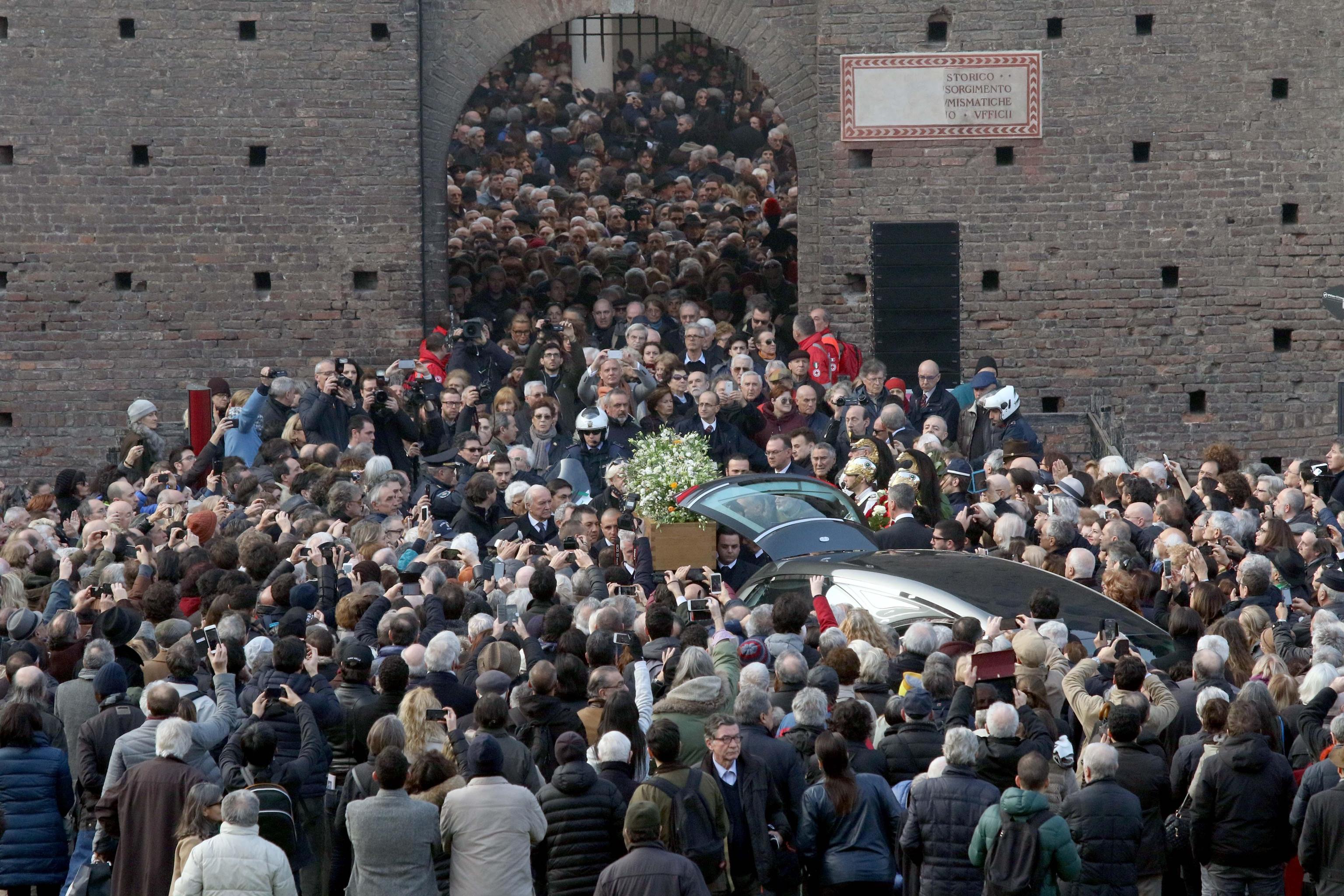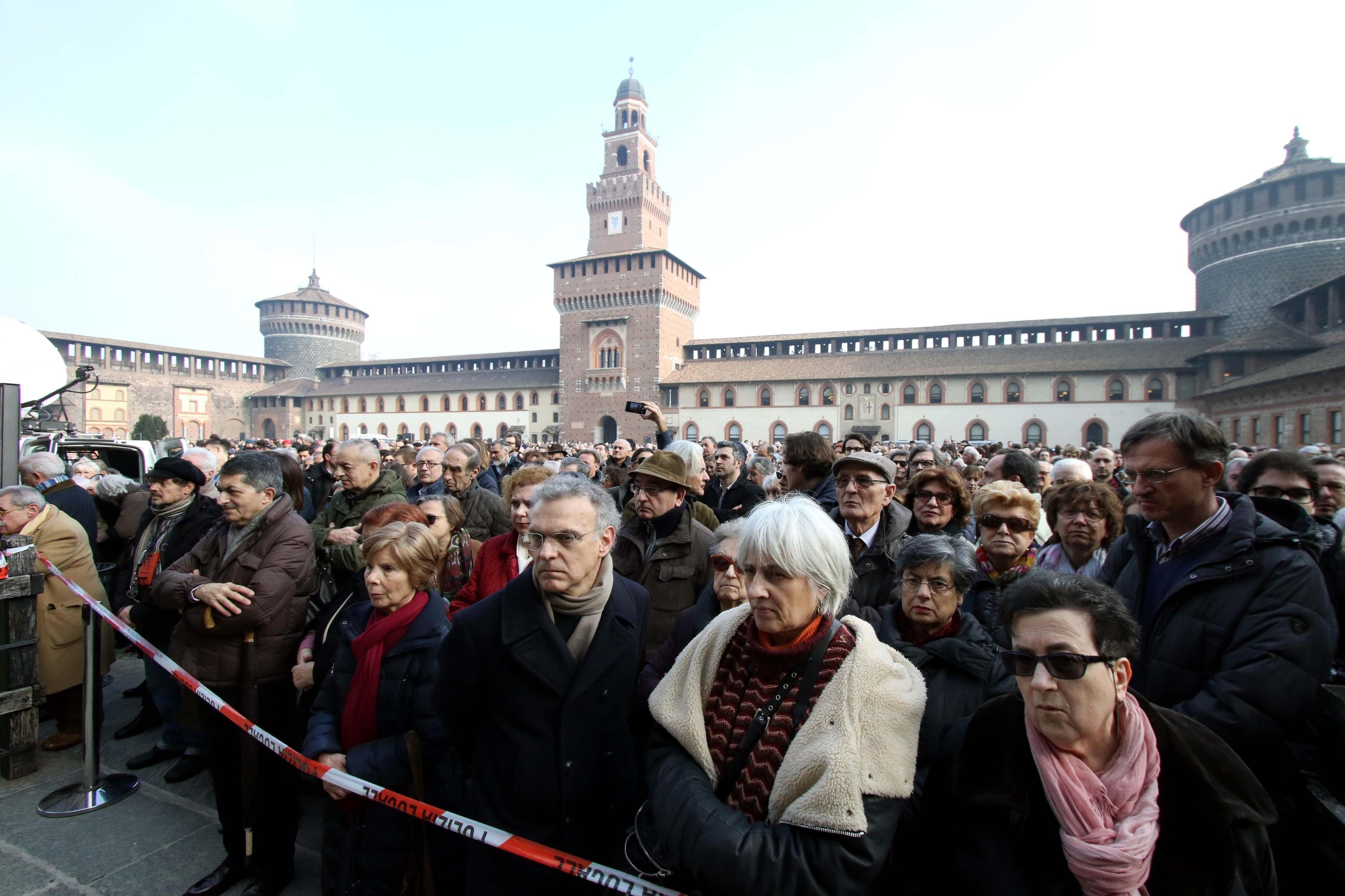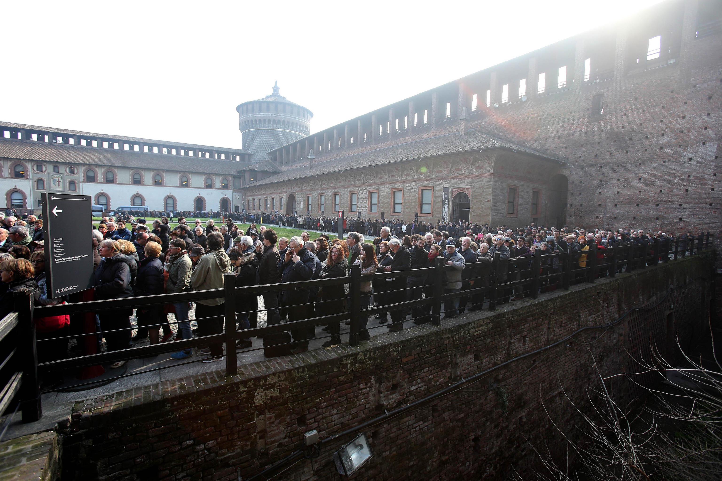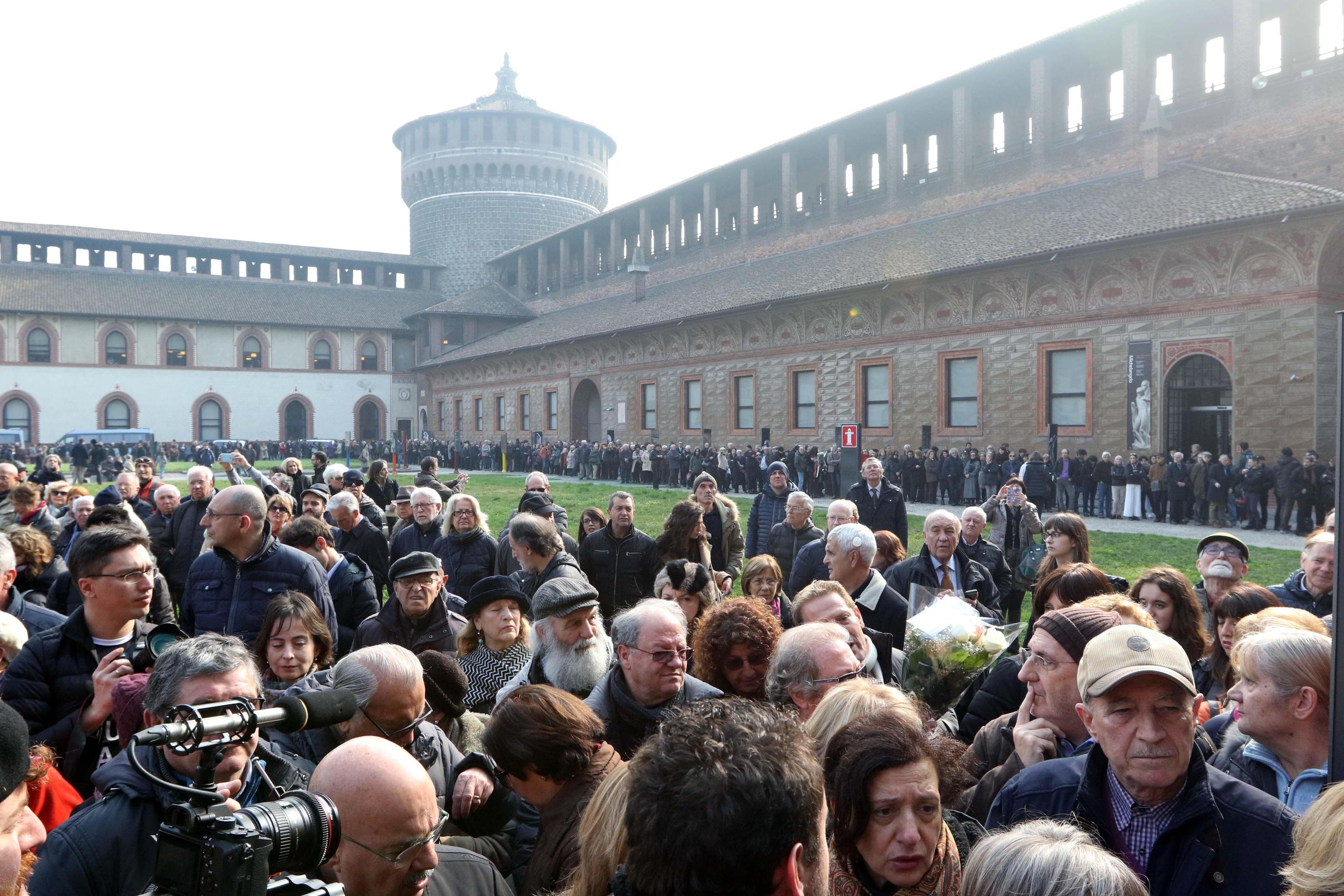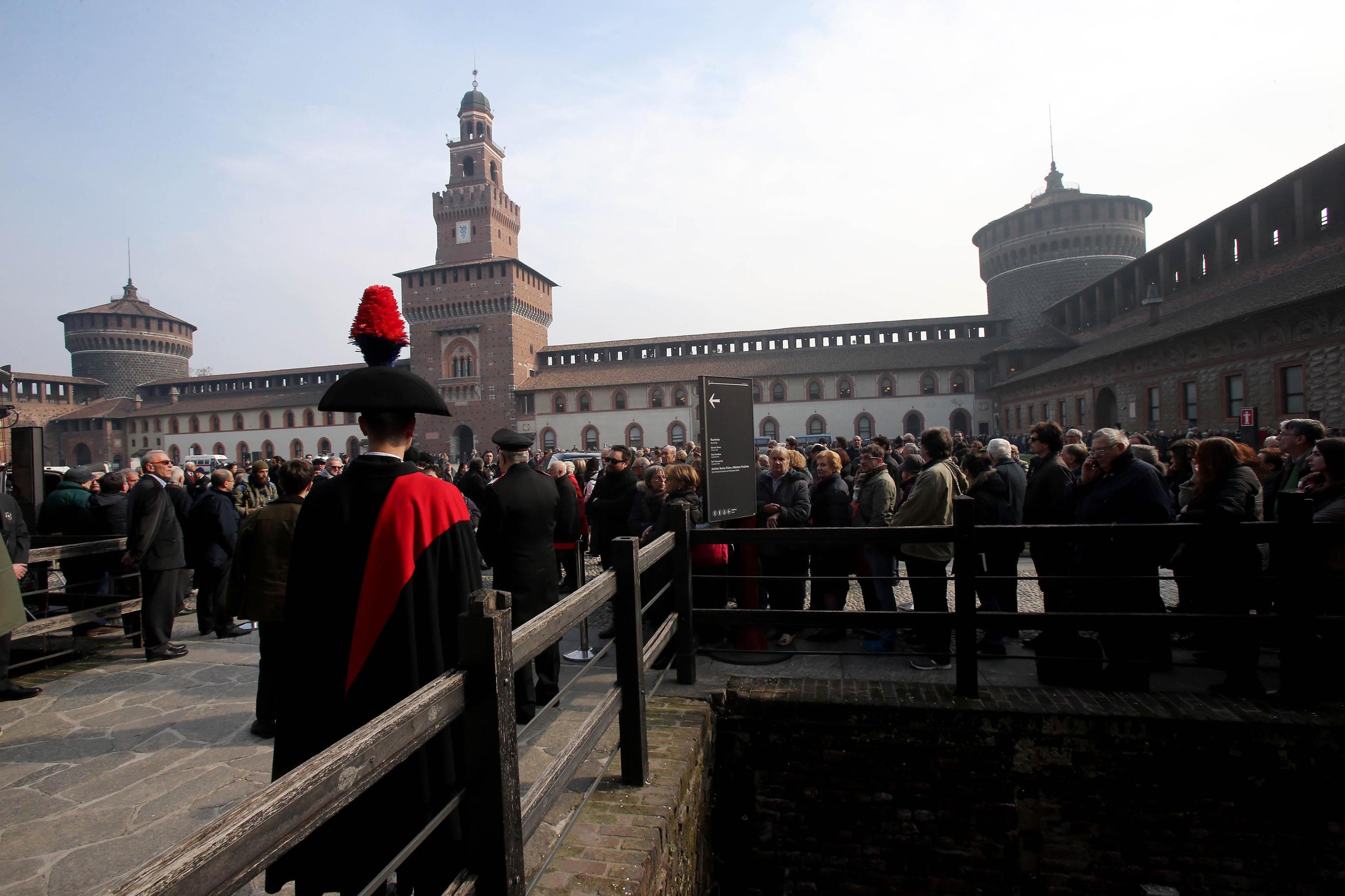 MILANO – In centinaia si sono radunati al Castello Sforzesco a Milano per dare un ultimo saluto a Umberto Eco. Dalle 14,30 del 23 febbraio il cortile della Rocchetta ospita il funerale del grande scrittore e studioso morto il 19 febbraio e celebrato secondo il rito laico. Il cortile può ospitare fino a 800 persone e in centinaia si sono messi in coda per avere l’occasione di prendere parte al rito funerario.