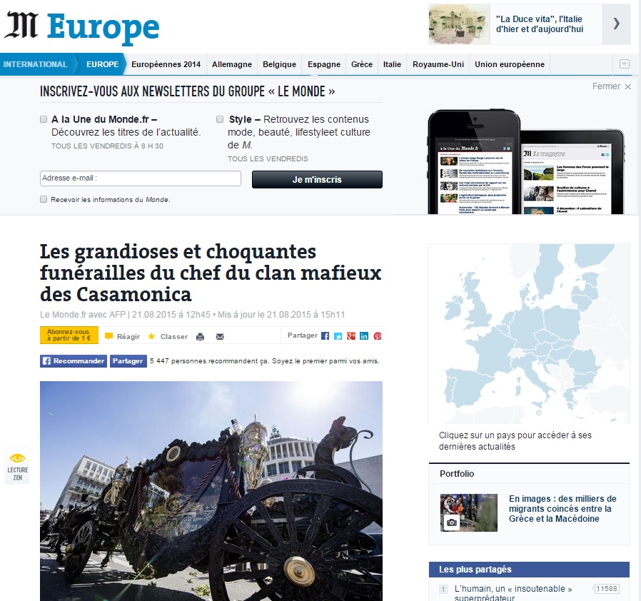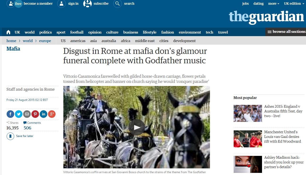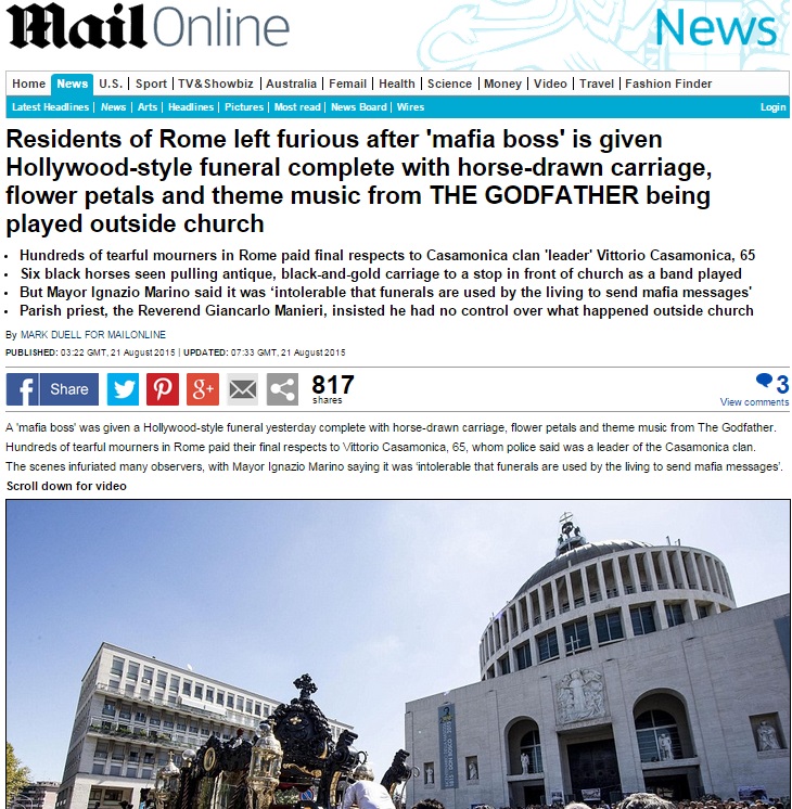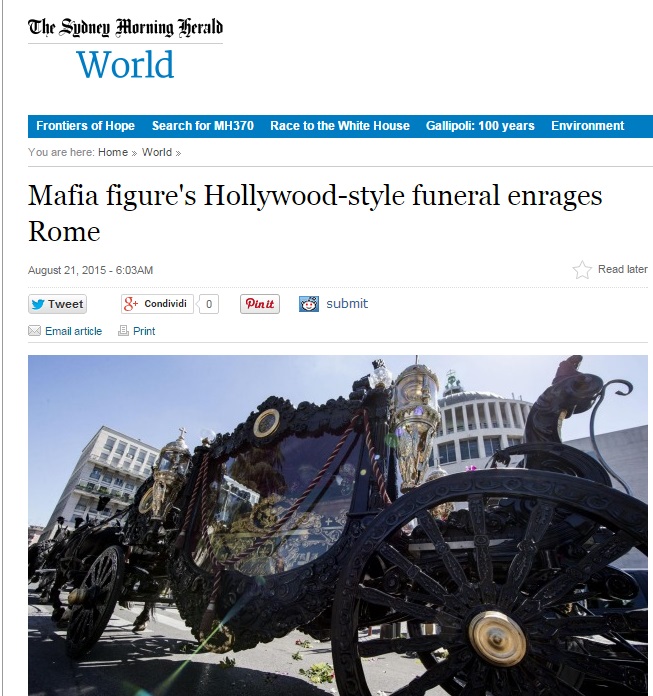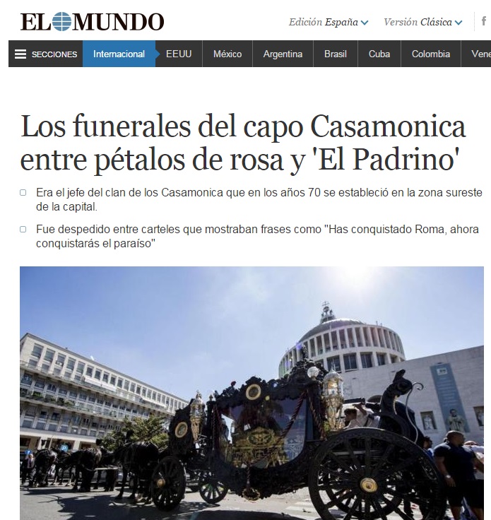 ROMA – I funerali a Roma in stile hollywoodiano del capo clan dei Casamonica, Vittorio, che si sono svolti giovedì 21 agosto sono stati ampiamente ripresi dalla stampa internazionale, dal New York Times al britannico The Guardian, passando dagli spagnoli El Mundo e El Pais ed i francesi Le Figaro e Le Matin, e finendo addirittura con ampio rilievo sull’australiano Sidney Morning Herald.