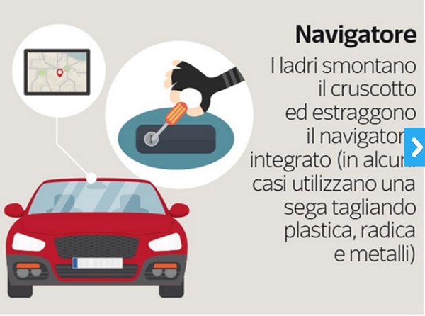 - I ladri smontano il cruscotto e estraggono il navigatore integrato (in alcuni casi utilizzano una sega tagliando plastica, radica e metalli).poi venderli, rigenerati.