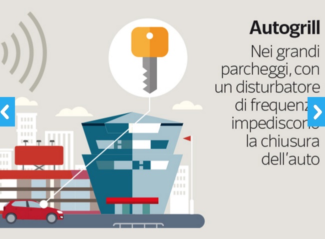 - Parcheggi di centri commerciali, aeroporti o stazioni: si utilizza un disturbatore di frequenza che interviene mentre l’automobilista tenta di chiudere la vettura con il telecomando. Risultato? L’auto resta aperta e il ladro può svuotarla.