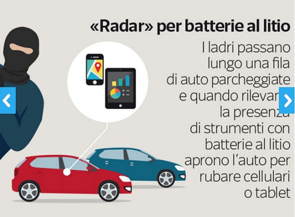 - “Radar” per batterie al litio: i ladri passano lungo una fila di auto parcheggiate e quando rilevano la presenza di strumenti con batterie al litio aprono l’auto per rubare cellulari o tablet.