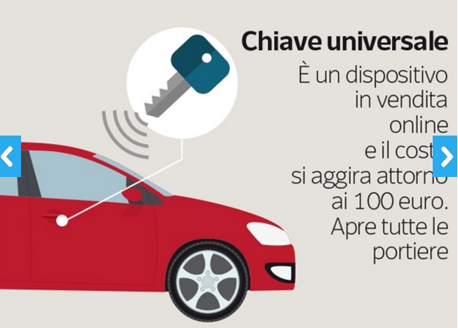 - Chiave universale: è un dispositivo in vendita on line e il costo si aggira attorno ai 100 euro. Apre tutte le portiere.
