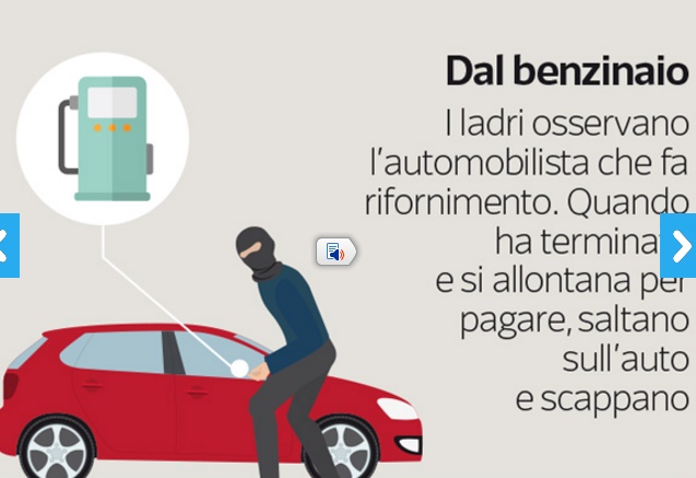- Dal benzinaio: i ladri osservano l’automobilista che fa rifornimento quando ha terminato e si allontana per pagare saltano sull’auto e scappano.