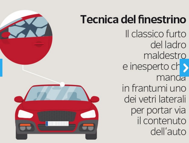- Tecnica del finestrino: il classico furto del ladro maldestro e inesperto che manda in frantumi uno dei vetri laterali per portar via il contenuto dell’auto.