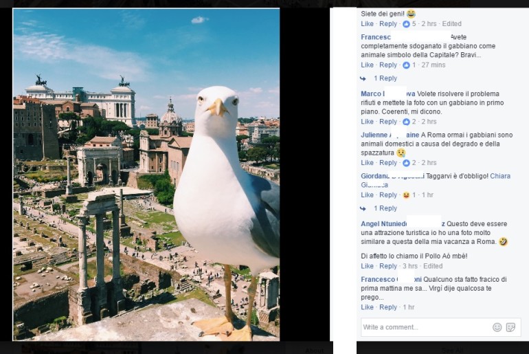 “C’è da vergognarsi a postare una foto così sul profilo ufficiale Facebook di Roma Capitale”, commenta un utente. “Il gabbiano vive nelle località di mare e Roma non è un porto. I gabbiani sono endemici a Roma per la spazzatura e la sporcizia perennemente a portata di becco”.