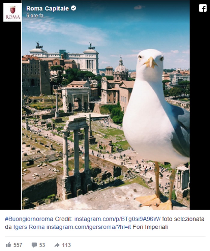 ROMA – Il Comune di Roma pubblica su Facebook una foto di buongiorno. L’immagine di oggi raffigura un gabbiano fotografato con dietro la visuale dei Fori Imperiali. L’immagine però non è piaciuta a molti che hanno fatto notare come il gabbiano sia un volatile presente a Roma solo grazie al fatto che la città è perennemente sporca.