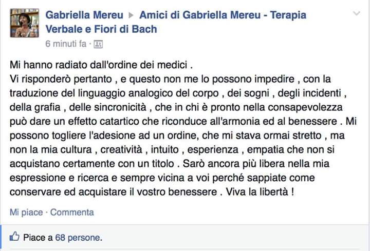 ROMA – Gabriella Mereu, la dottoressa che afferma di poter guarire tumori e lesioni con terapia verbale e fiori di Bach, è stata radiata dall’Ordine dei medici. Ad annunciarlo su Facebook è stata la stessa Mereu in un post pubblicato nel gruppo “Amici di Gabriella Mereu”. La radiazione dall’albo è arrivata dopo il servizio di Le Iene in cui la dottoressa afferma che la paralisi non esiste e che le parole possono curare patologie come il tumore o i calcoli.