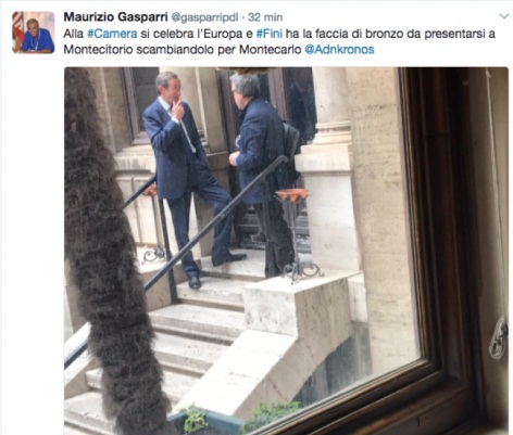 ROMA – Maurizio Gasparri fotografa Gianfranco Fini a Montecitorio, dove oggi Mattarella celebra il 60° anniversario dei Trattati di Roma, e ironizza: “Alla Camera si celebra l’Europa e Fini ha la faccia da presentarsi a Montecitorio scambiandolo per Montecarlo”. Naturalmente Gasparri si riferisce alla vicenda della casa di Montecarlo che vede coinvolto l’ex presidente della Camera e di Alleanza Nazionale.