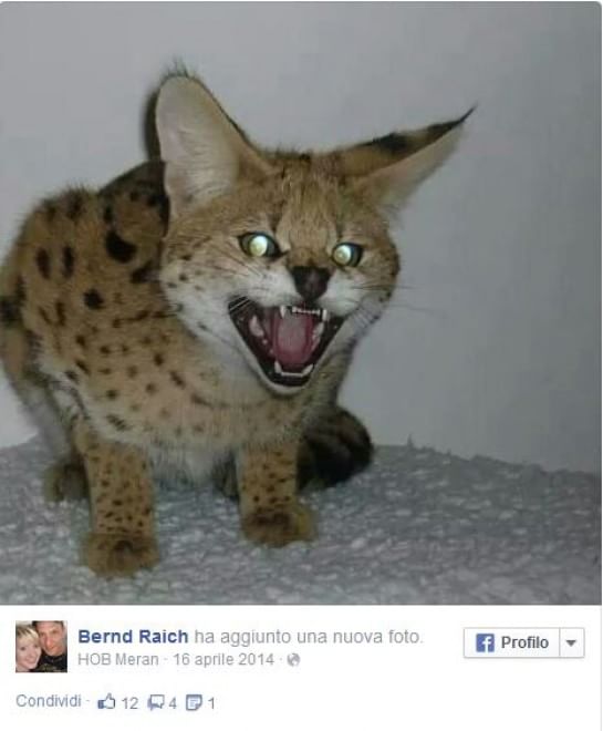 BOLZANO – Questo animale che assomiglia ad un gattone, si chiama Chiku ed è un Leptairulus serval, meglio noto come gattopardo africano. L’animale pesa 15 chili e secondo la legge vigente, non si può detenere in casa. Una famiglia altoatesina lo faceva vivere tranquillamente in casa come se si trattasse di un animale domestico.