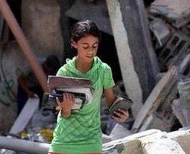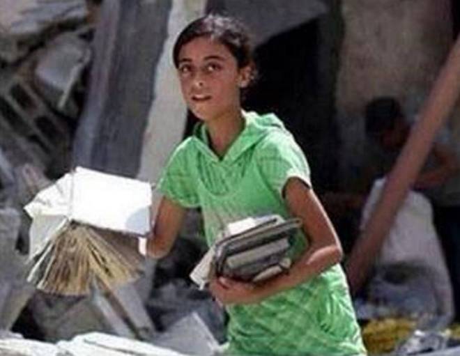 La giovanissima si accorge di essere fotografata, ma subito si rimette a cercare tra le macerie. Una volta trovati i libri, va via soddisfatta con il suo piccolo tesoro. Un’altra storia bella che arriva da Gaza, dopo quella della bambina fatta nascere dal grembo della madre morta sotto le macerie.
