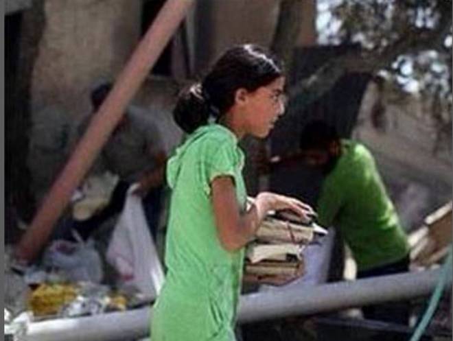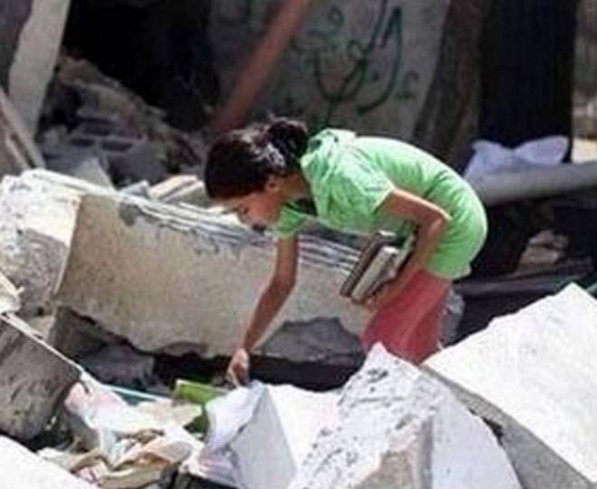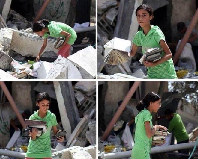 GAZA – Sotto le bombe di Gaza, c’è anche chi cerca di continuare la propria vita. E’ il caso di questa ragazzina che torna tra le macerie della sua casa per recuperare i preziosi libri di scuola.