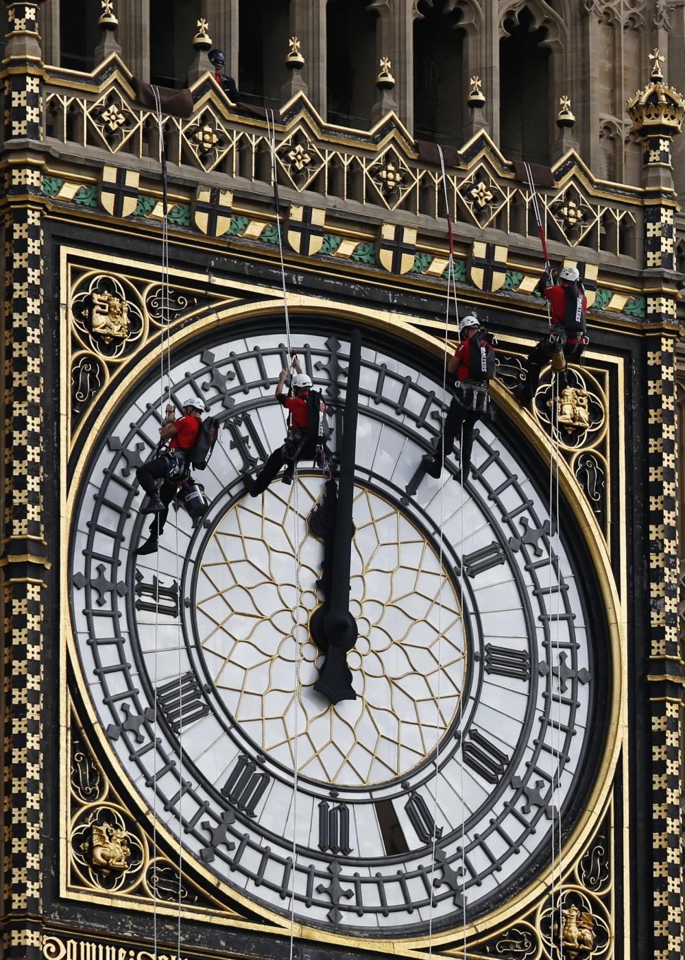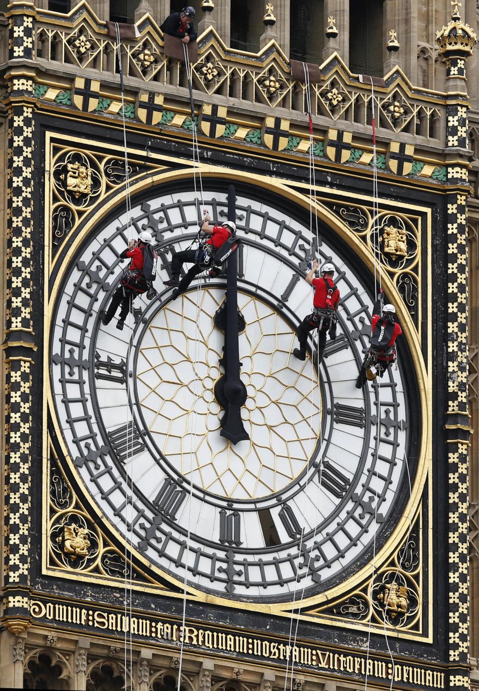LONDRA – Quattro operai molto speciali si sono arrampicati sul Big Ben a Londra per ripulire il quadrante dell’orologio più famoso del mondo. Bardati con cinghie e tiranti a 60 metri da terra, i tecnici hanno letteralmente ‘scalato’ il campanile del Parlamento di Westminster, che neppure i bombardamenti tedeschi della Seconda Guerra mondiale riuscirono a fermare.
