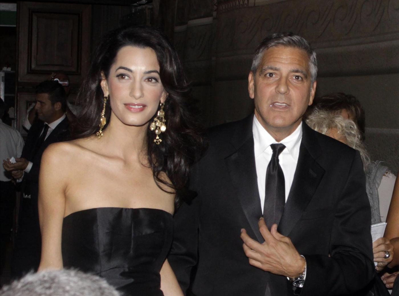 FIRENZE – George Clooney e la sua fidanzata Amal Alamuddin tra gli ospiti a Palazzo Vecchio per la cena di gala che si è svolta la sera del 7 settembre con asta di beneficenza della Celebrity fight night. “Mi sposerò il 26 settembre. A Venezia, in un antico palazzo” spiega Clooney abbracciato alla promessa sposa, bellissima in un abito nero da sera tempestato da cristalli, firmato Dolce & Gabbana. L’attore ha confermato finalmente le nozze con la bella avvocatessa specializzata in diritti umani ed ha spiegato: “Dopo la cerimonia andremo in viaggio di nozze solo tre giorni, poi il lavoro mi chiama”. Al suo arrivo a Firenze in piazza della Signoria, Clooney è stato accolto dal boato dei fan. Lui si è fermato, ha stretto mani e concesso autografi.