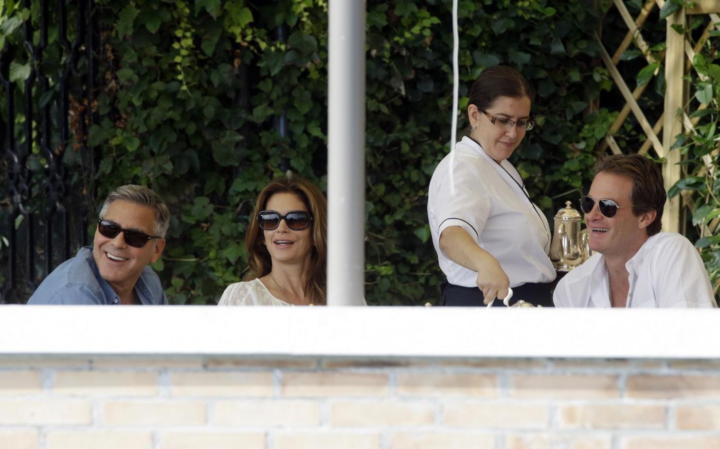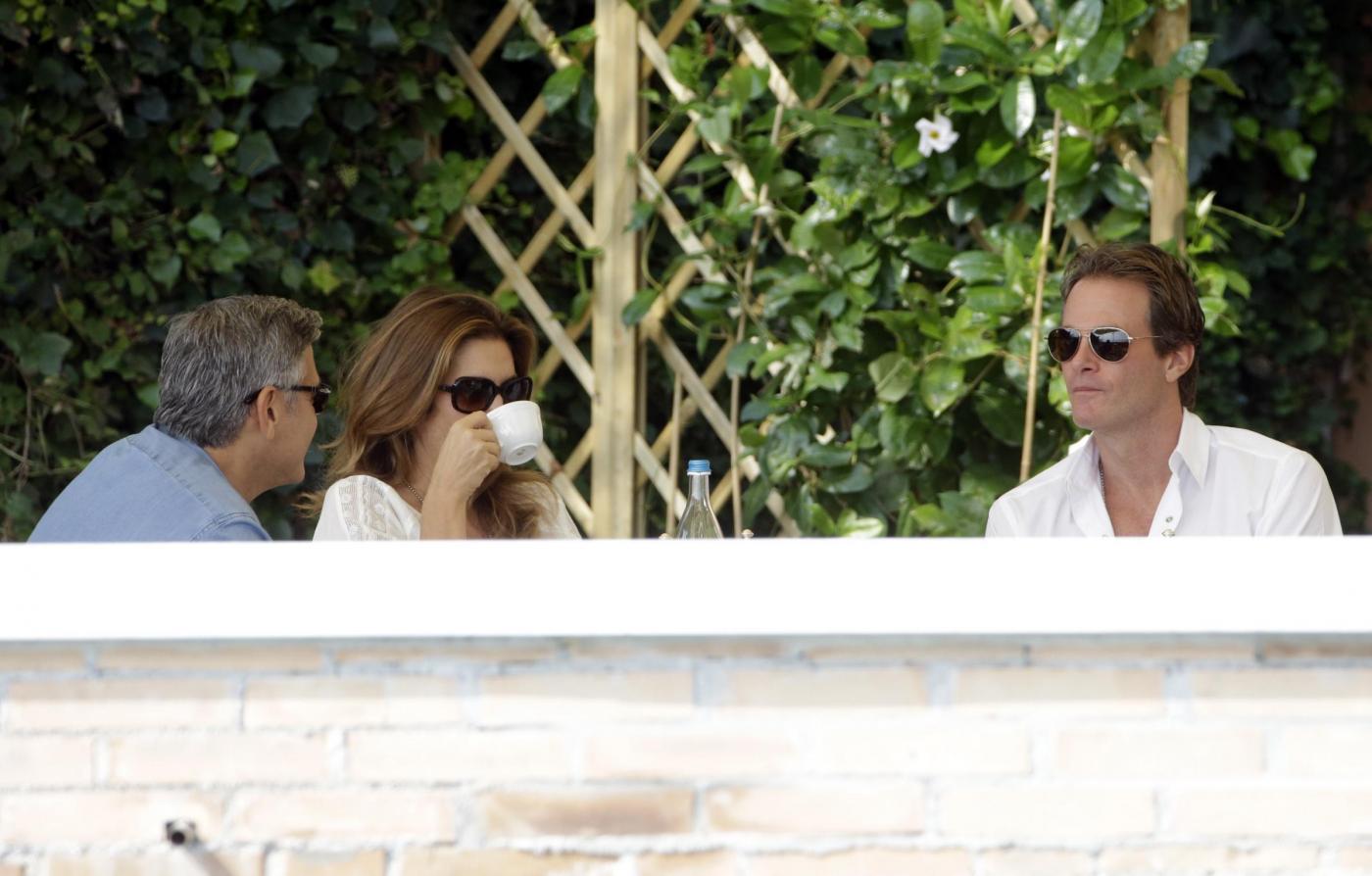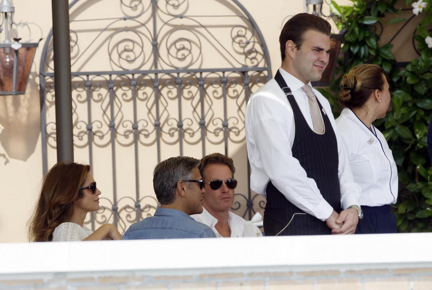 Clooney ha preso un caffè con l’ex modella Cindy Crawford e il marito Randy Gerber sul terrazzo dell’hotel Cipriani, che ospita la coppia e parte delle centinaia di invitati alla cerimonia. Il personale dell’hotel ha formato una sorta di barriera protettiva per Clooney e i suoi ospiti (foto LaPresse)
