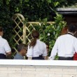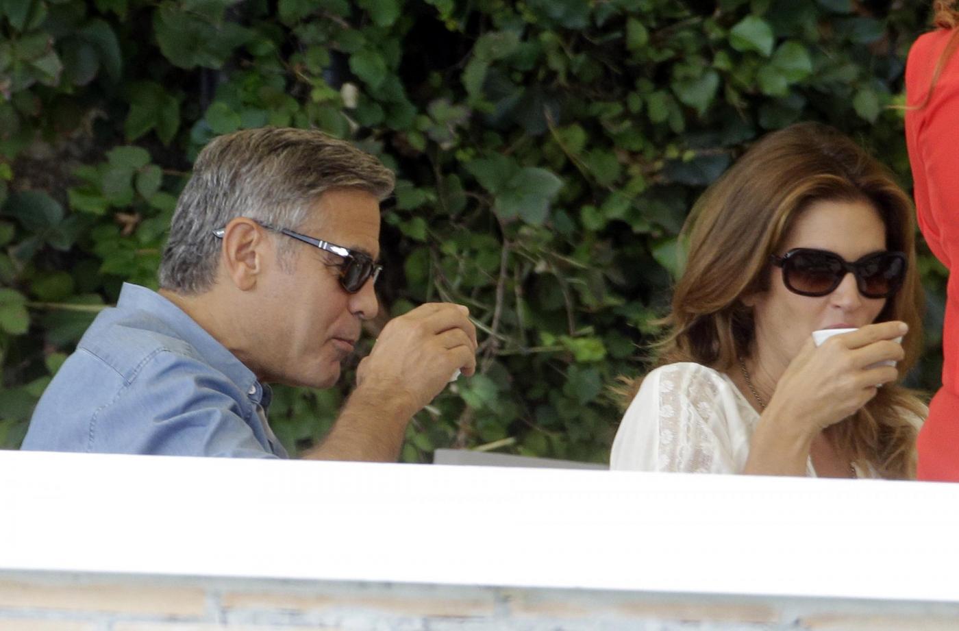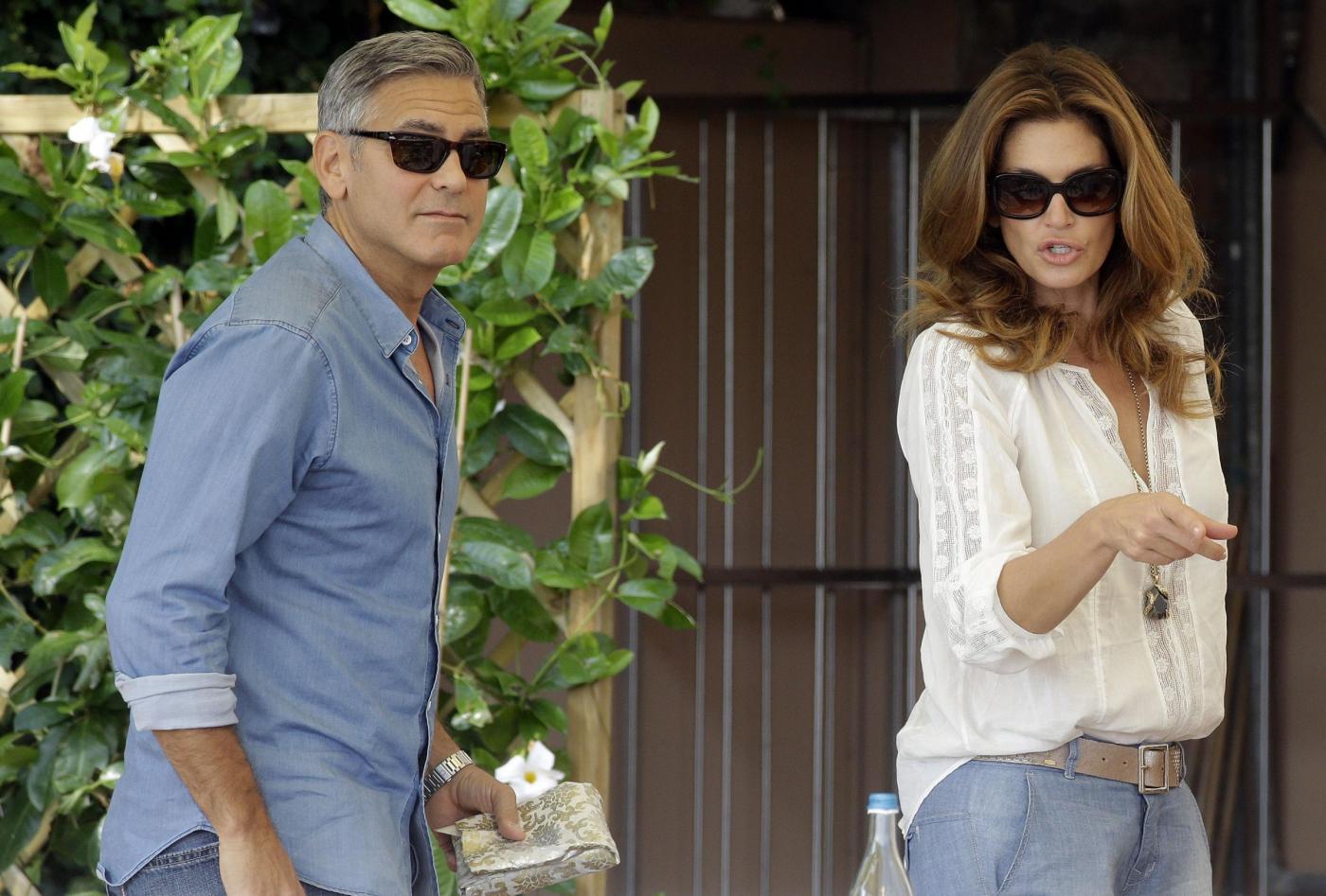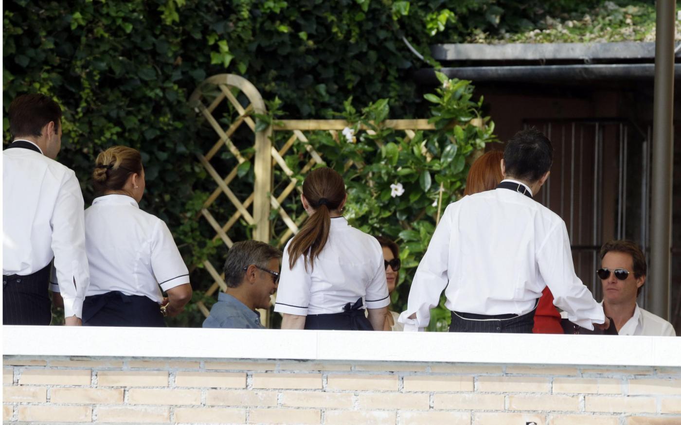 Clooney ha preso un caffè con l’ex modella Cindy Crawford e il marito Randy Gerber sul terrazzo dell’hotel Cipriani, che ospita la coppia e parte delle centinaia di invitati alla cerimonia. Il personale dell’hotel ha formato una sorta di barriera protettiva per Clooney e i suoi ospiti (foto LaPresse)