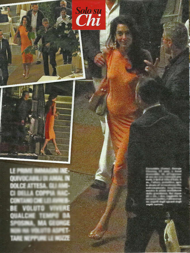 ROMA – Il settimanale Chi ha pubblicato le foto di Amal Alamumuddin, futura moglie di George Clooney, col pancione, o meglio, col pancino.