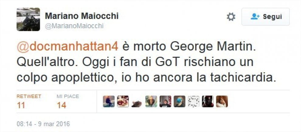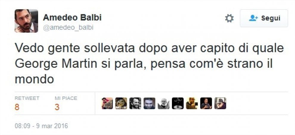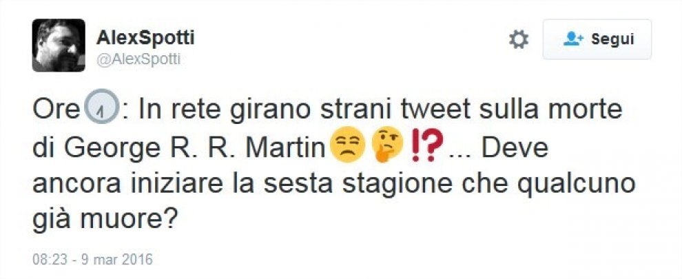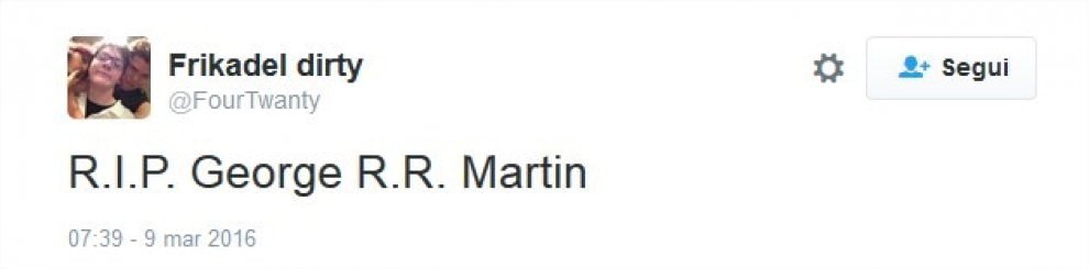 La maggior parte dei tweet vittima dell’equivoco arrivano dagli Stati Uniti. Ma anche in Italia in molti ci sono cascati. C’è chi si dispera perché “non sapremo mai come va a finire Game of Thrones“. E chi si è accorto dell’errore ma ammette di essere trasecolato alla notizia. Qualcuno ha un macabro senso dello humor: “George Martin ci ha preso talmente gusto che ora fa fuori anche i suoi omonimi”.