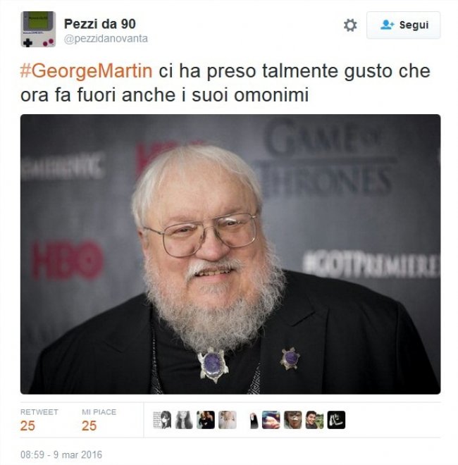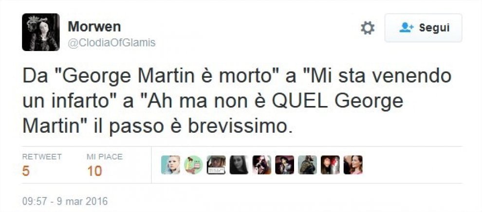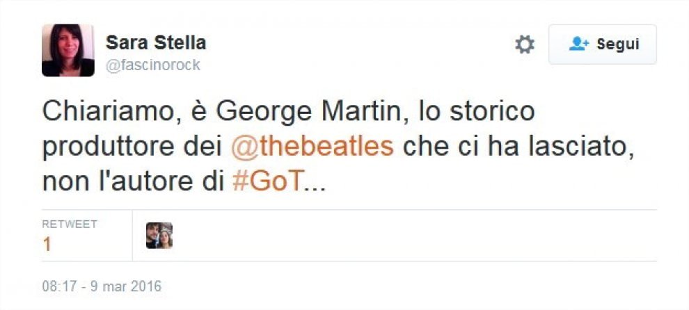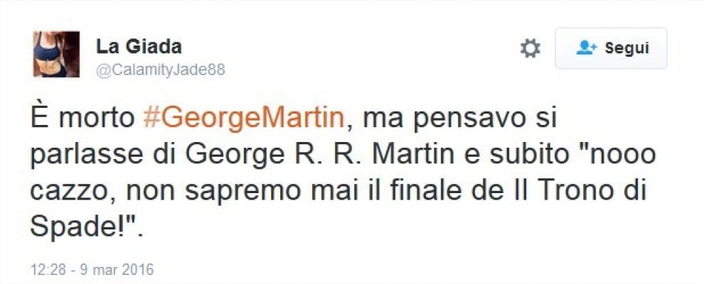 In realtà il suo nome completo è George R. R. Martin, che di anni ne ha 67 e non 90 come Sir George Henry Martin, e scoppia ancora di salute. Ad alimentare l’equivoco, probabilmente è anche il fatto che la morte improvvisa dello scrittore è l’incubo di molti fan della saga, anche perché Martin procede molto a rilento con la scrittura dei sequel. Il nuovo libro era atteso tra il 2014 e il 2015 ma non ha ancora visto la luce. Tant’è che la sesta stagione di Game of Thrones, che andrà in onda ad aprile, sarà la prima in cui la trama supererà il punto in cui sono arrivati i libri.
